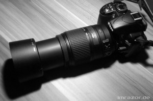 Die Ausmaße sind zwar noch relativ kompakt, allerdings wirkt es an meiner Nikon D3100 schon sehr groß, v.a. wenn der volle Zoom genutzt wird und die Gegenlichtblende gesteckt ist. Dann merkt man auch die Kopflastigkeit, die sich zwangsläufig einstellt, immerhin ist der Body der D3100 „winzig“ und leicht gegen das Objektiv selbst.