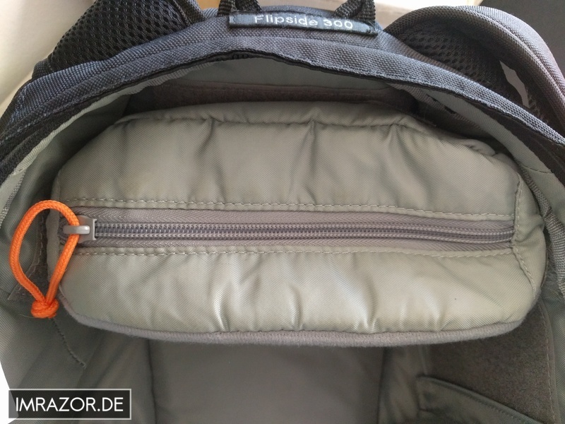 Und dann war der Rucksack auch schon fast voll und mir ist etwas aufgefallen, das mir vorher nicht bewusst war: Mir fehlt die die kleine herausnehmbare Innentasche (s. Foto) meines alten Lowepro Flipside 300. Nicht, dass ich das Teil je heraus genommen hätte, aber wegen der Möglichkeit auf Reisen Dinge sicher im Inneren des Rucksacks verstauen zu können: Reisepässe, Autoschlüssel, Geldbeutel, Tickets, Notizbuch, etc. Klar, das Zeug bringt man im Explorer auch irgendwo unter, aber im Innenbereich eher schwierig.