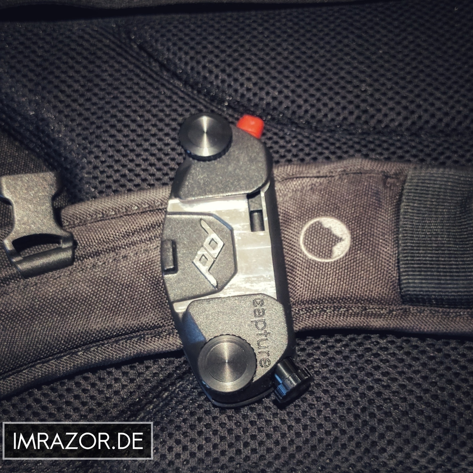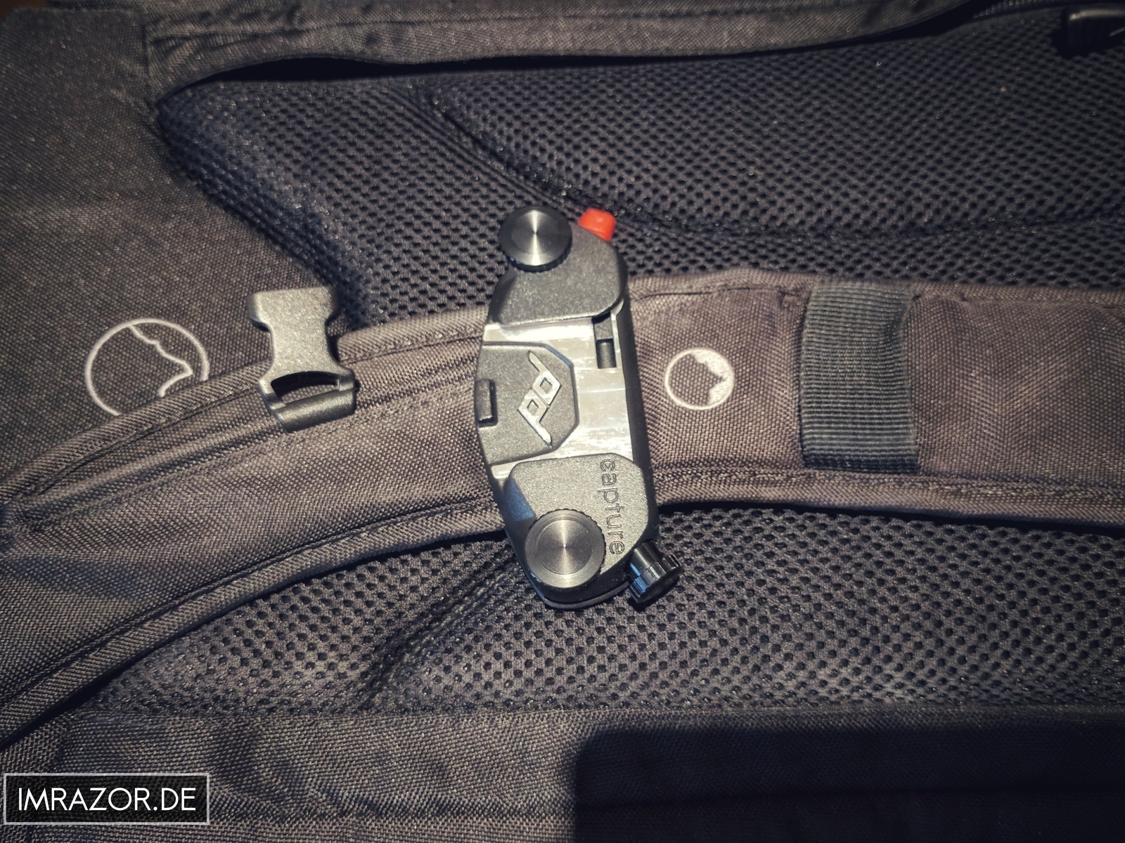 meinem Flipside 300, wie man auf Bild4 sehen kann. Lediglich dickere Träger benötigen anscheinend längere Schrauben, wie manch Rezensent auf Amazon bemängelt hat. In der Praxis ist das ganze für mich wirklich perfekt und genau das, wonach ich schon lange gesucht hatte. Will man vorübergehend nicht fotografieren und die Hände frei haben, schnappt man die Kamera einfach in den Clip ein, der Nacken ist entlastet und nichts baumelt an einem rum. Das Ding hält bombenfest und ich hatte nie ein ungutes Gefühl – trotzdem habe ich den Gurt einfach um den Hals hängen lassen. Den Capture Clip gibt es übrigens auch noch in einer Pro-Ausführung die eine Rückplatte aus Alu hat und verstärkt ist, auch die Schnellwechselplatte ist universeller bzw. kann sie für andere Stativ-Systeme, z.B. Manfrotto benutzt werden. Ich selbst habe mich aber wegen dem Mehrpreis gegen die Pro-Version entschieden und wurde von der „Standard-Version“ nicht enttäuscht.