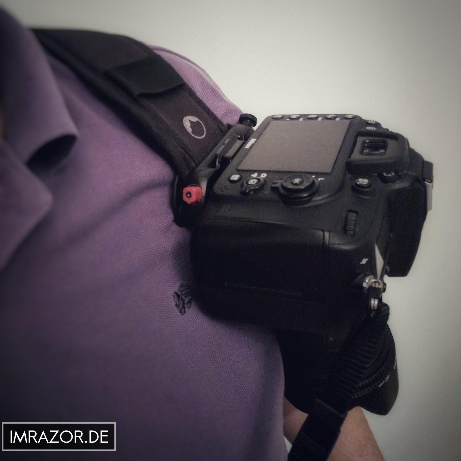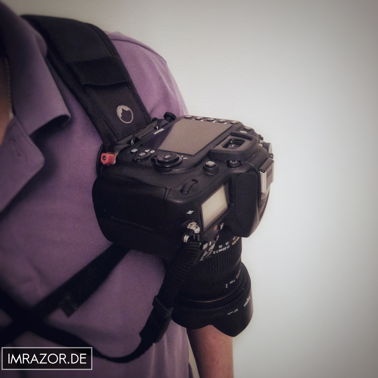 Mein Interesse war geweckt, genau sowas brauche ich auch! Knapp unter der Schulter auf der Seite getragen, ist die Kamera nicht zu tief und würde wohl auch beim Gehen oder Bücken nicht stören!