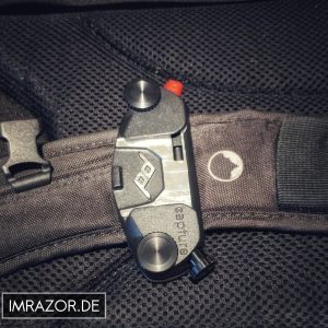 Nach kurzer Google-Recherche bin ich dann recht schnell auf das System von peak design gestoßen: Der sogenannte Capture Clip. Dieser Clip wird aufgeklappt und z.B. um den Kameragurt gelegt, zugeklappt und dann mit den Rändelschrauben verschraubt und zusammengepresst. Die Kamera selbst wird mit einer Arka Swiss kompatiblen Schnellwechselplatte (Bild3) versehen (im Lieferumfang) und dann von oben in den Clip eingehängt (siehe Bild1 und Bild2). Zum Herausnehmen der Kamera muss lediglich der rote Knopf gedrückt werden und die Kamera kann nach oben herausgezogen werden. Will man die Kamera zusätzlich sichern, kann auf der rechte Seite der schwarze Arretierungsknopf hinein gedreht werden. Das ganze funktioniert tadellos an