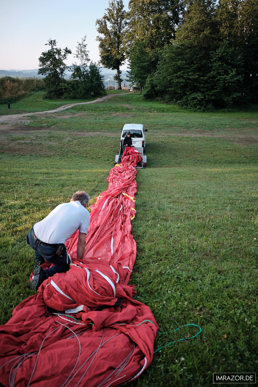 Nachdem wir der Reihe nach ausgestiegen waren, wurde die restliche heiße Luft genutzt, um den Korb gleich auf den Anhänger des Begleitfahrzeuges zu hieven. Als der Korb abgesetzt war, wurde die heiße Luft abgelassen und die Ballonhülle auf der Wiese kontrolliert abgelegt. Jetzt hieß es wieder zusammenhelfen: Die Ballonhülle falten, in die Transporttasche und auf den Anhänger zum Korb verfrachten. Die gut 250kg sind mit 8 Personen aber ein Kinderspiel.