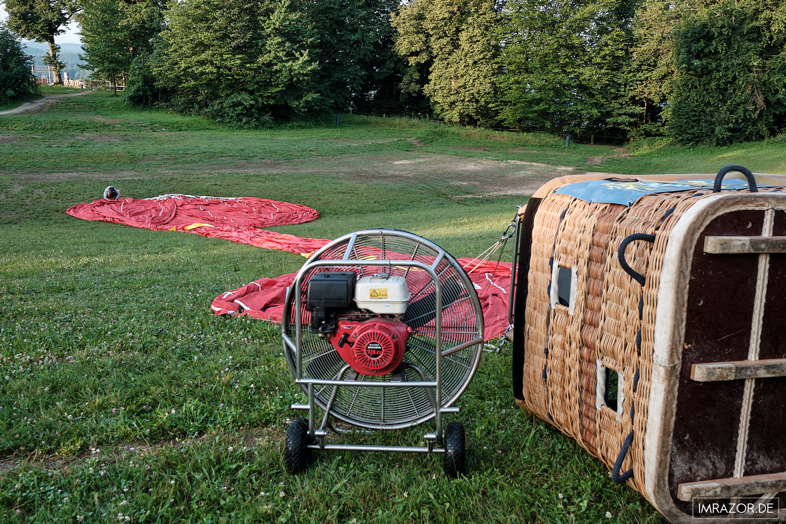 Ballonfahren ist auch eine Gemeinschaftsaktion, zumindest wenn es um Auf- und Abbau des Ballons geht. Unter fachkundiger Anweisung des Piloten und seines Begleiters (Begleitfahrer, der den Ballon und die Gäste nach der Landung wieder aufliest) wird die Hülle ausgerollt und aufgehalten, damit zuerst mit einem großen Gebläse Luft in die Hülle geblasen werden kann. Danach wird mit dem Gasbrenner die erste heiße Luft in den noch liegenden Ballon gestoßen: Die Hülle bläht sich kontinuierlich auf, bis sich der Ballon schließlich komplett aufrichtet. Das Ganze dauert ca. 30 Minuten, bis wir 6 Passagiere und der Pilot startklar sind.