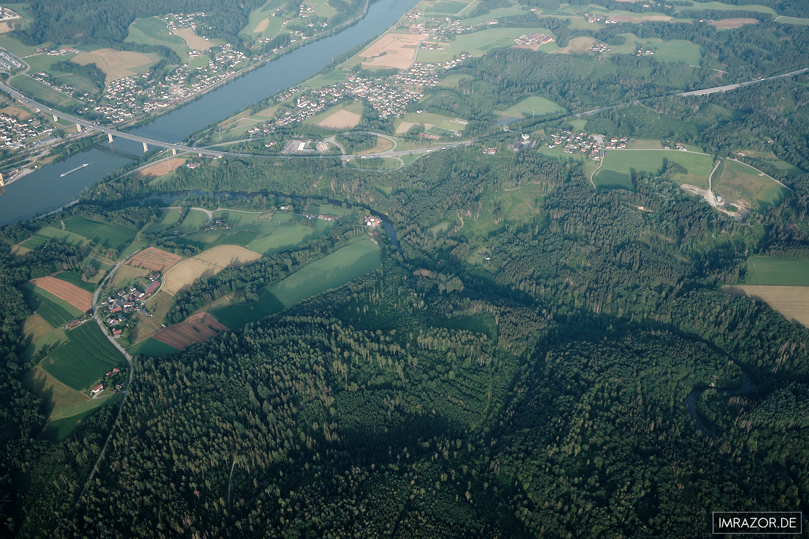 So nimmt uns kurz nach dem Abheben schließlich die Luftströmung donauauffwärts mit und führt uns bis vor die Autobahnbrücke der A3 auf Höhe Patriching. Mittlerweile haben wir gut 2200m Höhe erreicht. Die Sonne steht noch tief, Gebäude und Bäume werfen lange Schatten in die sommerliche Morgenlandschaft. Wir fahren jetzt mit etwa 30km/h Richtung Osten, man merkt keinen Wind, auch ist es an diesem Sommermorgen alles andere als kalt. Wir schweben über die heimatlichen Landschaften, während der Pilot uns viele Dinge erklärt und beim Identifizieren von Ortschaften hilft.