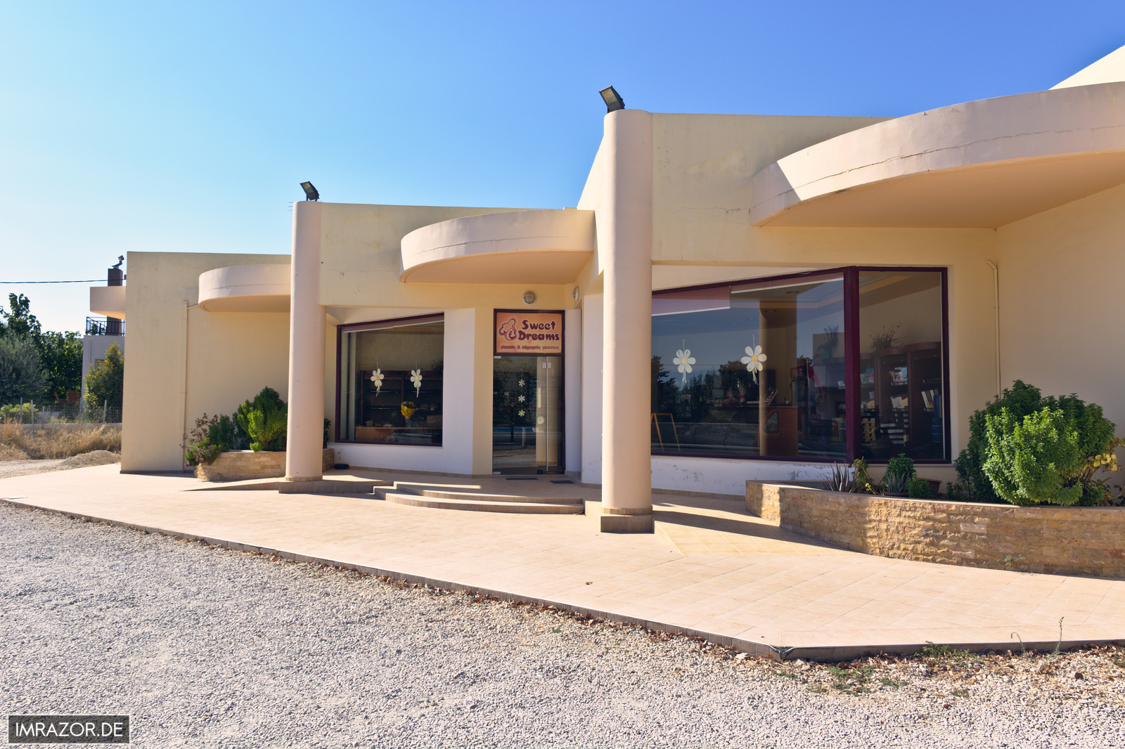 Unweit der Ortseinfahrt findet sich ein relativ neuer Bau in Alleinlage: Die Bäckerei/Konditorei Sweet Dreams lockt mit griechischen und deutschen Spezialitäten – kein Wunder, wird der Laden doch von Griechen betrieben, die ebenfalls in Deutschland lebten und zurück kamen.