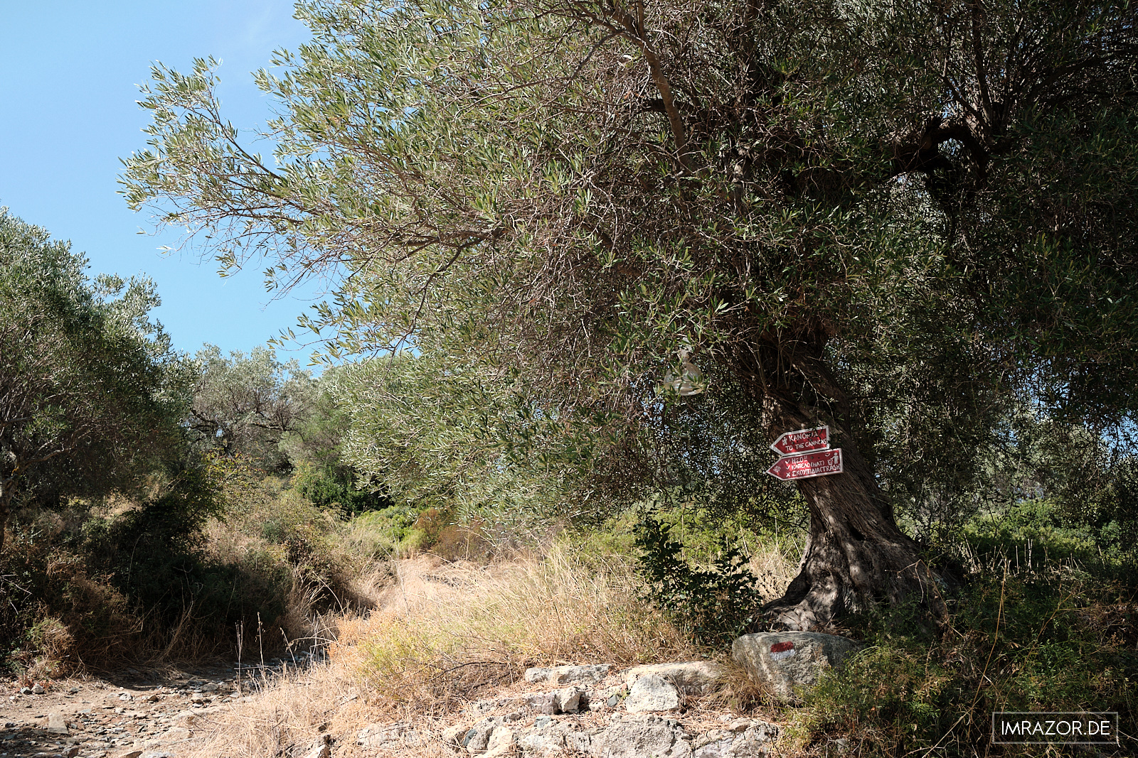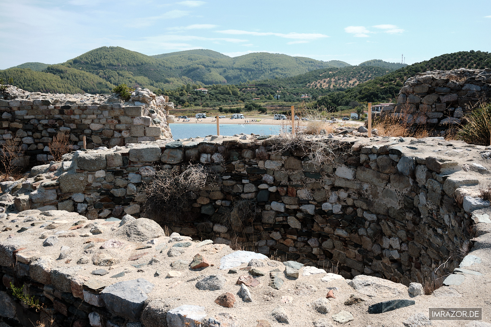 Wir starteten unsere Fahrt am Geranion Village und machten uns auf, die Halbinsel Sithonia zu erkunden. Unser erster Halt war Toroni, ein charmantes Küstendorf mit langer Geschichte. Die kleine Uferpromenade und die Überreste der antiken Festung verleihen dem Ort eine besondere Atmosphäre, während der Strand zum Verweilen einlädt. Die Gegend südlich von Toroni bietet interessante Wanderrouten zu antiken Überresten, wie der Akropolis von Toroni. Ich machte mich zu einem kurzen Abstecher auf den Weg, kehrte aber nach vielleicht zwei Kilometern wieder um: Die Sonne war so erbarmungslos und der Schatten so dürftig, dass ich mich zur Rückkehr entschied. Eine richtige Wanderung muss bei solchen Temperaturen geplant sein: Ohne Sonnenschutz und genügend Wasser kann ein solches Vorhaben schnell böse ausgehen. Für Frühjahr und Herbst aber sicherlich eine tolle Wandergegend.