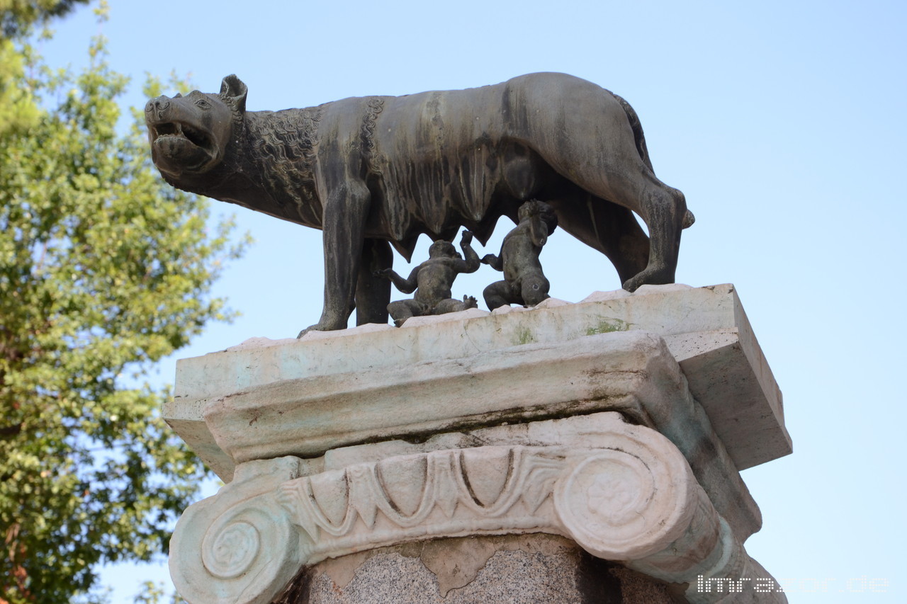 Wir zücken also wieder unser Kombiticket (das sogar für mehrere Tage gültig ist) und marschieren durch das Forum Romanum Richtung Kapitol. Nach einigen Foto-Pausen und Reisefürerblättern verlassen wir das Forum Romanum auf der östlichen Seite und steigen die Treppen empor zum Kapitol, an dessen Ende und schon die Romulus und Remus Skulptur erwartet (das Original der capitolinischen Wölfin ist übrigens in den capitolinischen Museen zu bewundern).