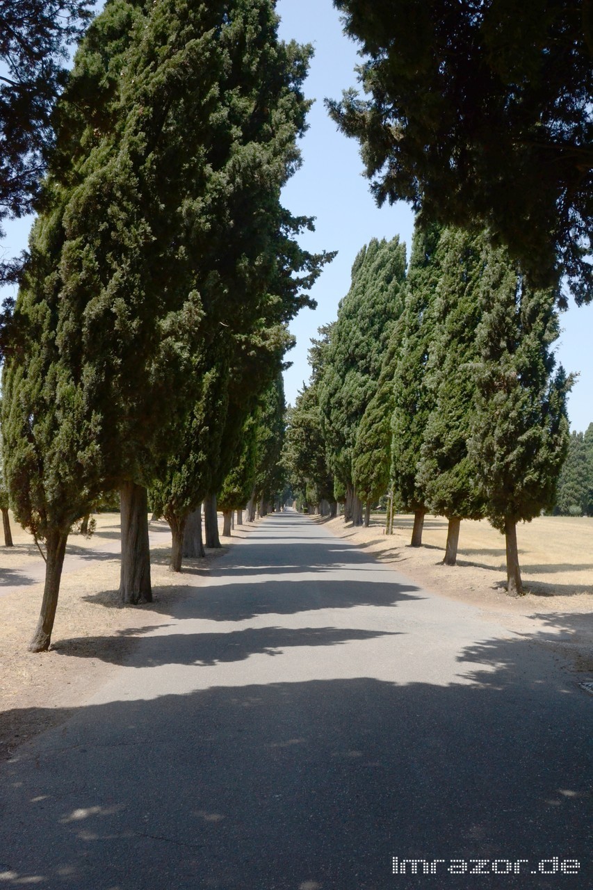 Unserer weiterer Weg führt uns zum Lateran, wo wir die Basilika San Giovanni in Laterano besichtigen und den wundervollen Kreuzgang, der alle Brände der Vergangenheit überstanden hat. Am Lateran, dem Sitz des Bischofs von Rom, also dem Papst suchen wir uns die Bushaltestelle (Linie 218) beim Laterans-Obelisken, von wo aus wir zur Via Appia Antica starten. Wir steigen direkt bei den Calixtus Katakomben aus dem Bus aus und gehen durch das dazugehörige Areal durch die prachtvolle Allee zur eigentlichen Via Appia Antica. Am Sonntag ist nämlich ein Durchfahrtsverbot und man kann ungehindert über die alte Straße wandern. Am Grab der Cecilia Metella vorbei gehen wir bis zum Anfang der antiken Überreste der Prachtstraße: Hier liegen noch die Steinquader aus römischen Zeiten als Straßenbelag.
