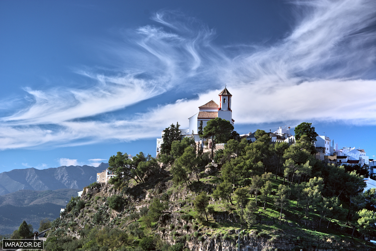 Übrigens sind wir von Osten auf kürzestem Weg nach Ronda gefahren, d.h. die Straßen sind nicht gerade super ausgebaut, und es sind unzählige Kurven und Steigungen zu bewältigen. Die grandiose Landschaft entlohnt einem aber mehrfach für den Weg. Man durchquert den Naturpark Sierra de las Nieves, ein Gebirgszug mit tiefen Schluchten und Abgründen. Mit 1919m ist der Torrecilla hoch genug, damit hier Schnee gesammelt werden konnte – hier rührt auch der Name des Gebirgszuges her, der übersetzt soviel heißt wie Schneegebirge. Die Landschaft ist sehr abwechslungsreich und auch so manche Ortschaft auf dem Weg lohnt eine kleine Pause. Ein wahres Schmuckstück ist dabei Alozaina, deren Häuser sich an und auf einen Hügel schmiegen. Den höchsten Punkt nimmt eine kleine Kirche ein, die weithin sichtbar ist. Ein super Fotospot, wenn man einfach auf der Zufahrtsstraße zur Seite fährt und den Blick genießt, während man den richtigen Bildausschnitt sucht.