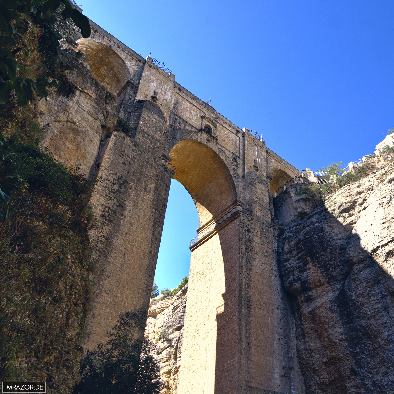 Für mutige, die den besonderen Fotospot suchen hier ein Tipp: Hält man sich in der Altstadt immer rechts, erreicht man nach ein paar Minuten den Plaza Maria Auxiliadoria. Hier gibt es einen tollen Aussichtspunkt, der aber keinen guten Blick auf die Puente Nuevo bietet, in deren Nähe jedoch ein Weg hinab zur Brücke führt. Und mit hinab zur Brücke meine ich eigentlich hinab unter die Brücke. Ein inoffzieller Weg, der mit diversen Warnschildern gespickt und auch schon arg reparaturbedürftig war. Hier muss man gewaltig aufpassen, dass man nicht abstürzt, es geht stellenweise senkrecht nach unten! Irgendwann befindet man sich dann unter der Brücke und kann die riesigen Pfeiler bestaunen.