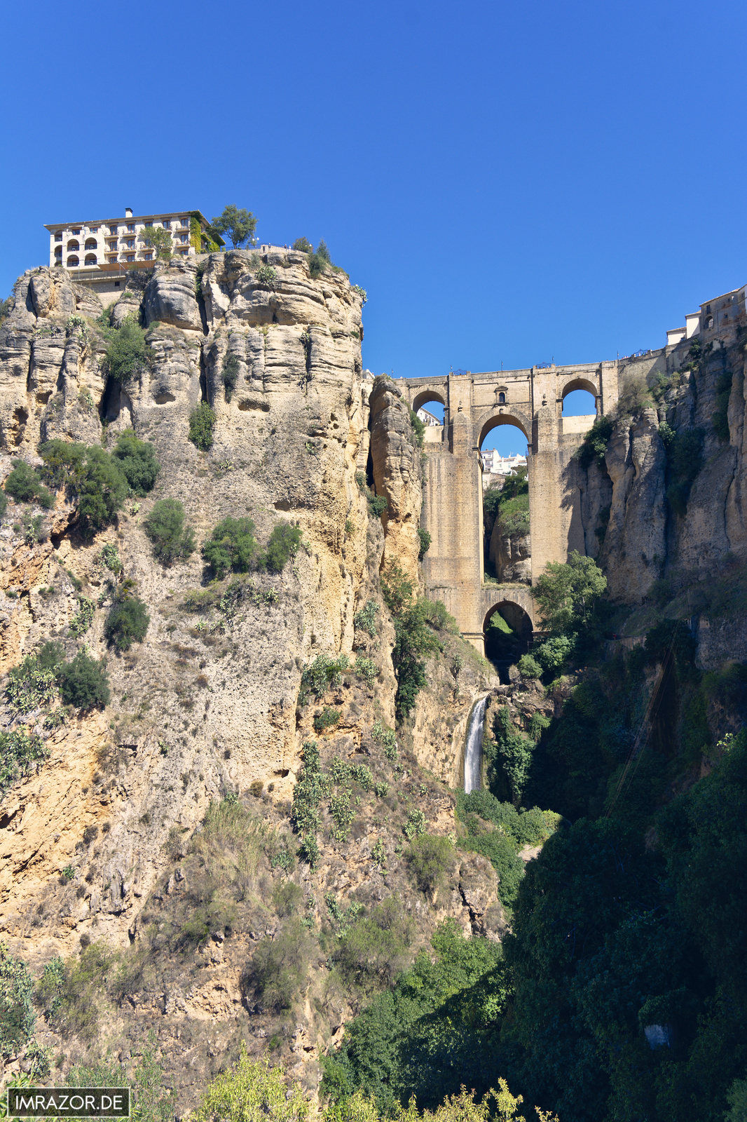 Auf dem Rückweg empfiehlt es ich dann noch dem offiziellen Weg etwas zu folgen, denn dann erreicht man einen Aussichtspunkt mit perfektem Blick auf die Brücke und den Wasserfall, der unter ihr hervorschießt. Postkartenmotiv lässt grüßen! Ronda ist wirklich ein dankbares Fotoparadies mit tollen Motiven an jeder Ecke.