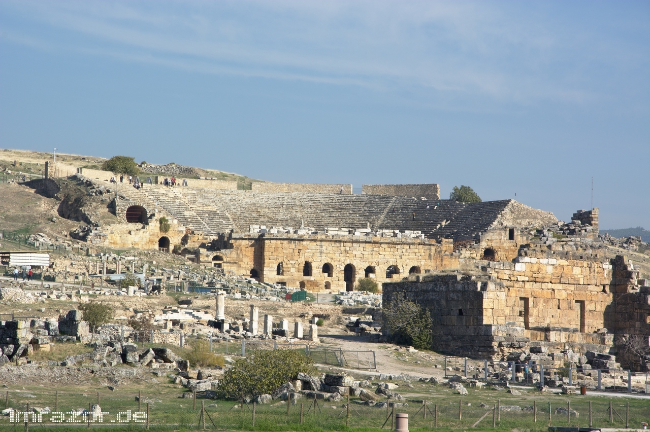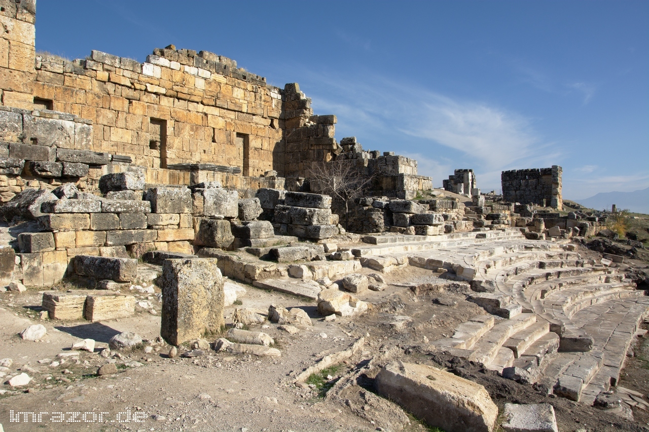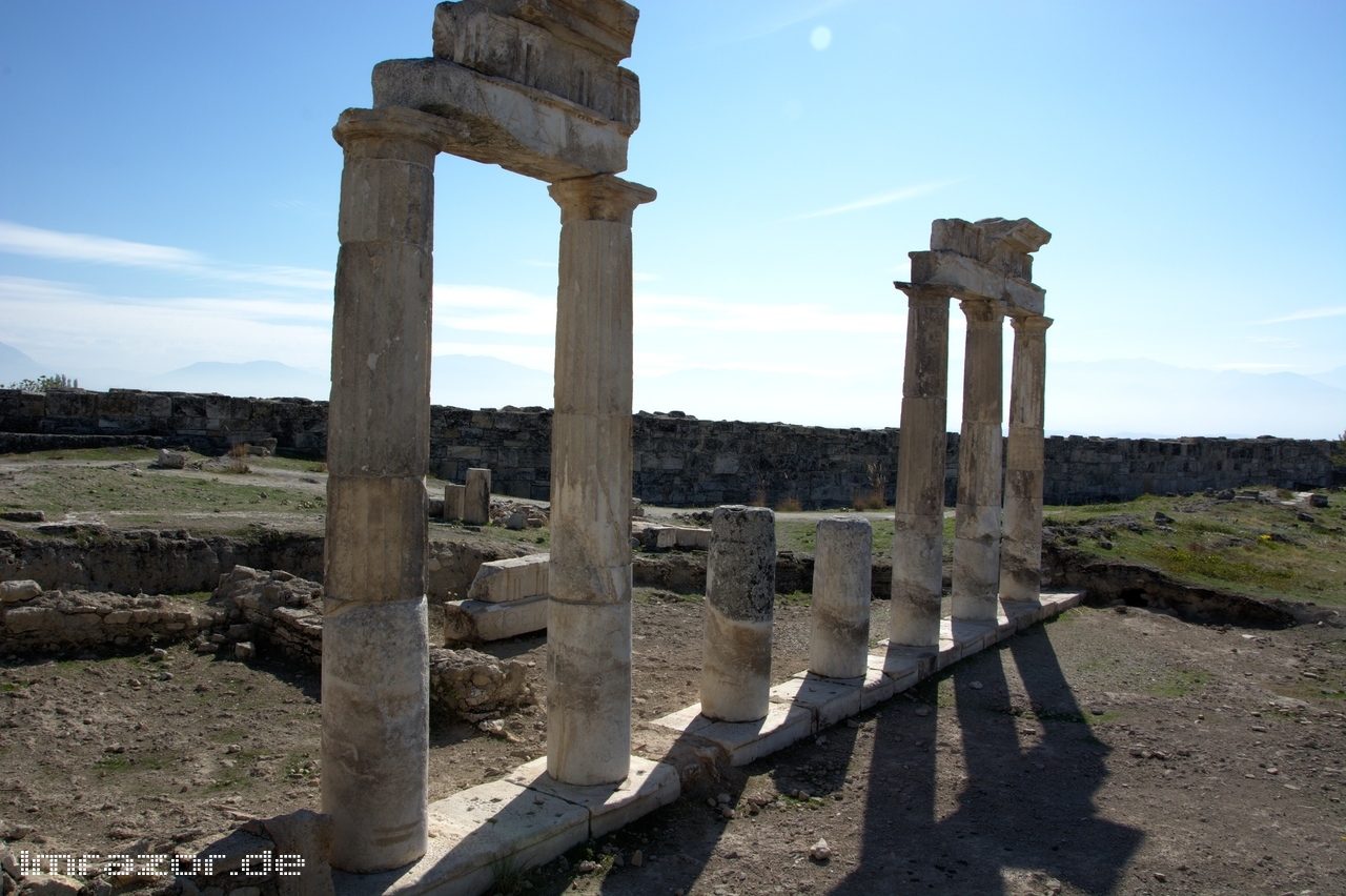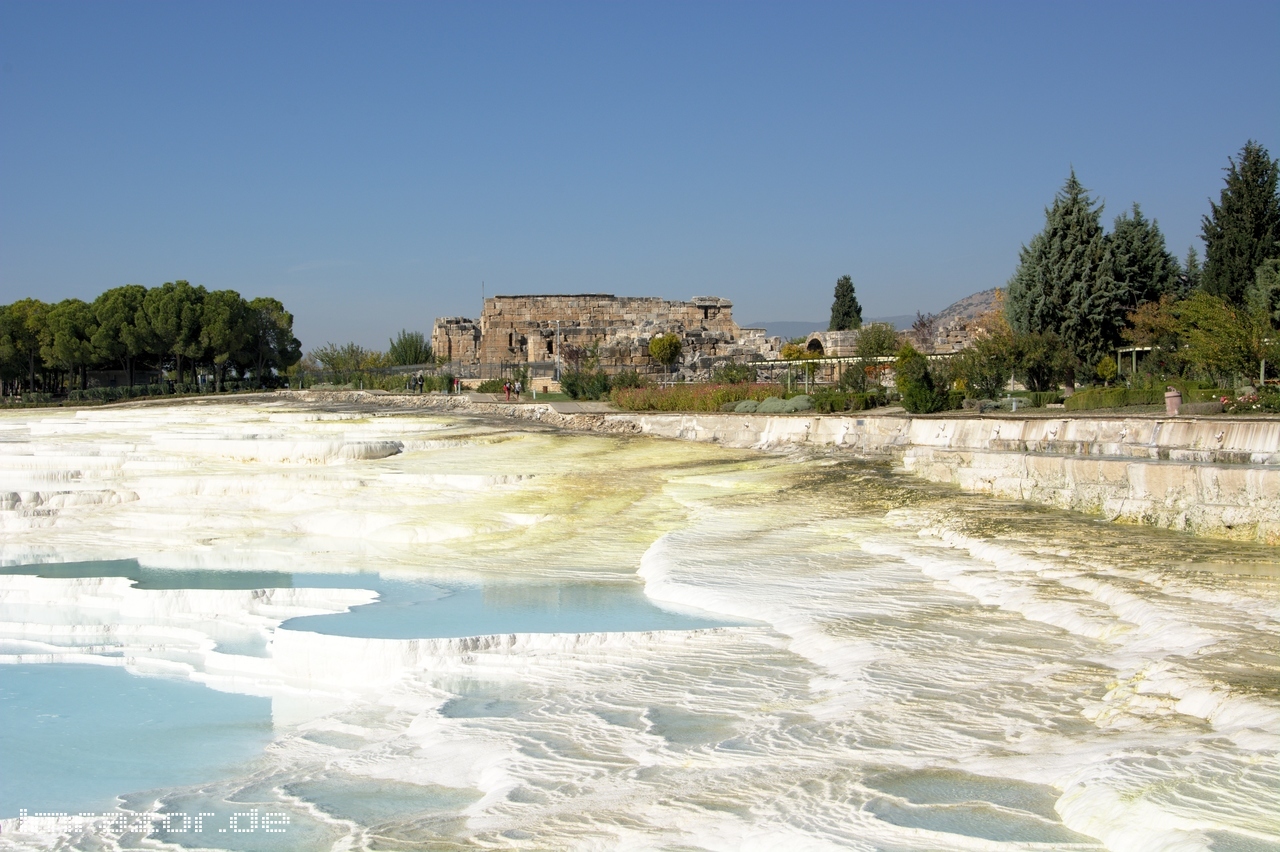 Wandert man auf dem Plateau weiter nach hinten, erreicht man nach nicht allzu langem Weg die antiken Überreste der Stadt Hierapolis. Schon in der Antike waren die Thermalquellen bekannt, die bereits damals die Terrassen formten. Das Wasser wurde zur Färbung von Wolle genutzt, aber auch für den antiken „Kurort“.