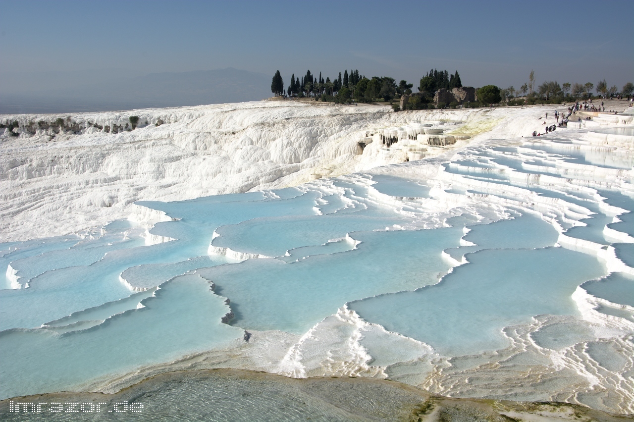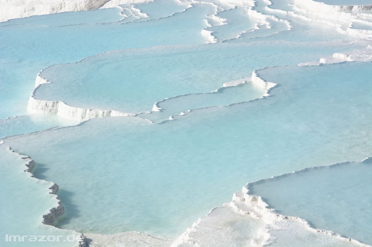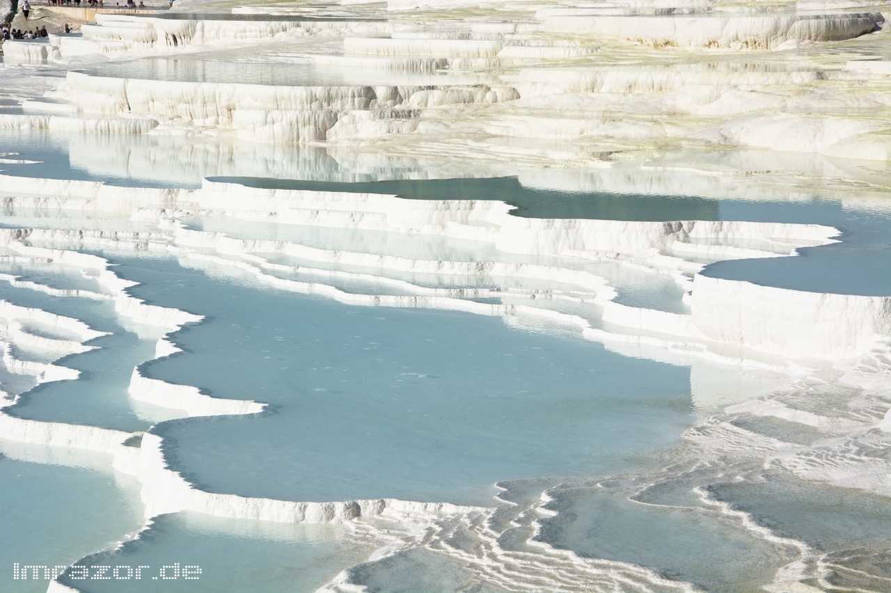 Nach dem Mittagessen im Thermalbad-Hotel ging es dann weiter zu den Kalksinterterrassen in Pamukkale. Um diese zu erreichen, fährt der Bus auf die Anhöhe und wartet am dortigen Parkplatz. Auf manchen Postkarten oder alten Fotos sieht man noch, wie Touristen wild in den natürlich geformten Becken baden oder querfeldein durch die Terrassen nach unten gehen. Heute zurecht streng verboten, da die fragilen Kalkbecken nur beschädigt würden. Allerdings gibt es einen ausgewiesenen Weg vom Plateau nach unten zum kleinen See. Dieser darf nur Barfuß begangen und nicht verlassen werden. Nachdem unser Bus aber oben gewartet hat, sind wir nicht hintergelaufen. Aber auch so liefern die Terrassen einen atemberaubenden Anblick.