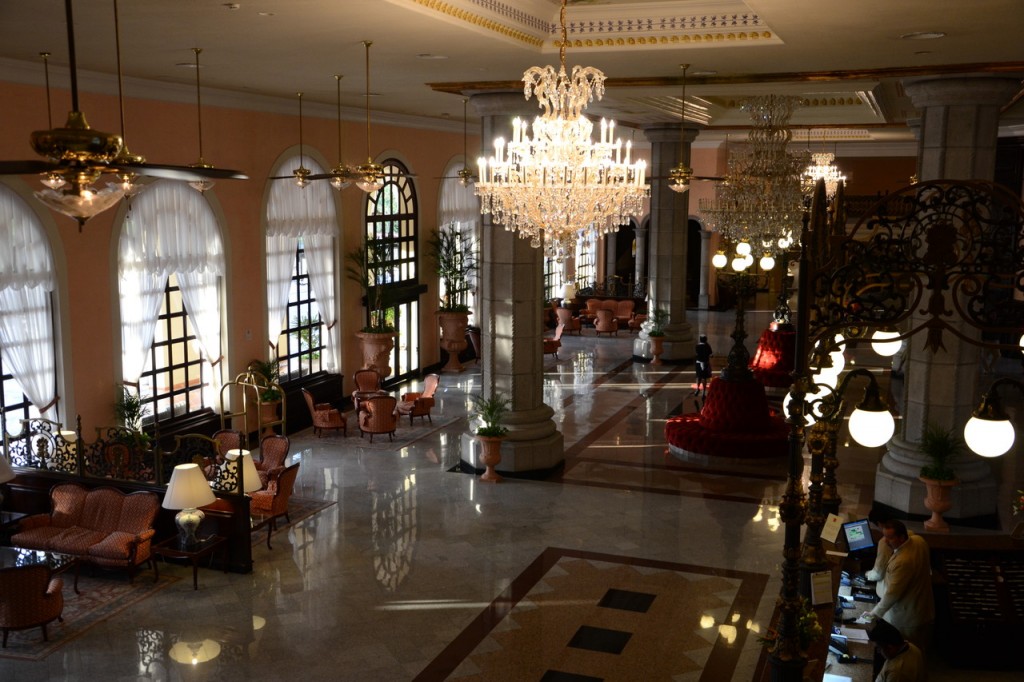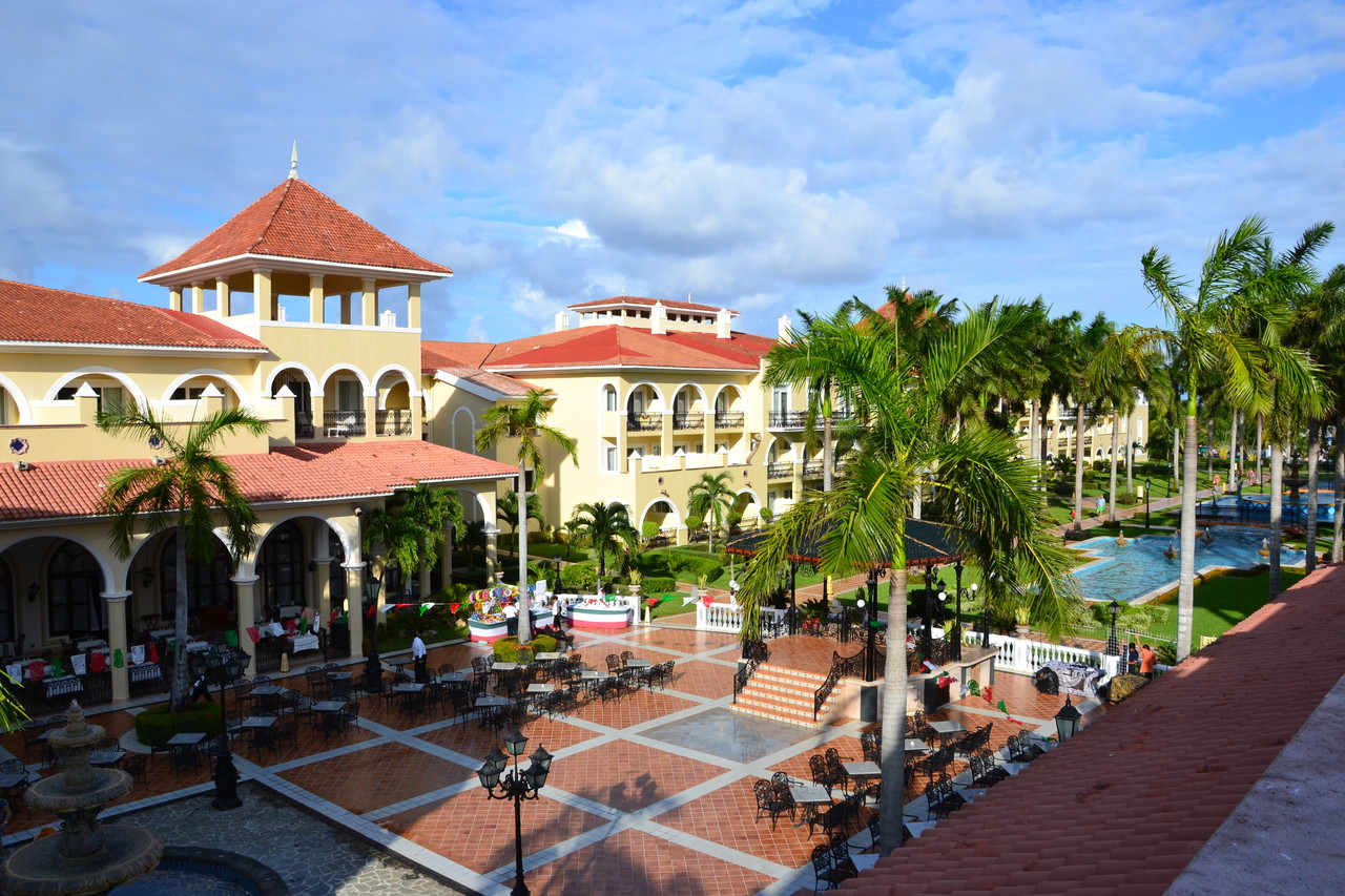 Der Hotelkomplex wirkt wie ein großer Palast in kolonialem Stil. Das Hauptgebäude ist zum Meer hin ausgerichtet, die Seitengebäude mit den Zimmern liegen sich direkt gegenüber. Der Bereich zwischen den Gebäuden ist mit riesigen Palmen und Brunnen gestaltet. Hat man die Hotelgebäude hinter sich gelassen erreicht man auch schon die Poollandschaft, die etwas abgenutzt wirkt und von uns sowieso nicht genutzt wurde (Urlaub am karibischen Meer und dann in einen gechlorten Pool steigen?! Geht gar nicht!). Hier findet sich dann auch die die kleine Poolbar, die alle erdenklichen Getränke im Angebot hat. Weiter geht’s Richtung Strand. Folgt man dem Weg nach links, erreicht man den SPA-Bereich, der Weg nach recht führt zu den Themen-Restaurants für italienische und mexikanische Küche, die kontinentales Frühstück, Mittagessen und a la Carte Menüs am Abend bieten.