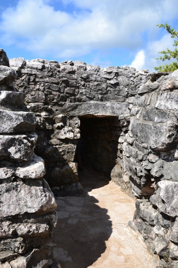 Man betritt die Stadt also an einem der Eingänge durch die sehr gut erhaltene Stadtmauer, die sie zur Landseite hin komplett abschirmt. Mit unserem Reiseleiter namens Ricardo (der äußerst unterhaltsam die Geschichte der Maya vermittelte) haben wir Tulum also nördlichen Küstenabschnitt betreten und als erstes das Haus des Cenote besichtigt. Hier kann man bereits die atemberaubende Szene sehen, die Tulum einem bietet: Hoch auf einer Klippe steht der Wind-Tempel, darunter das türkis blaue Meer, die weißen Wolkenpakete ziehen über das Land hinweg – die reinsten Postkartenmotive. Das größte Highlight ist natürlich „El Castillo„, mit seinem Tempel auf der Spitze, der mit der Darstellung des „herabsteigenden Gottes“ verziert ist. Wahrscheinlich diente er Seefahrern als Orientierung, denn man konnte nur in seiner Nähe an Land gehen. Überall sonst ist Steilküste oder sumpfiges Hinterland.