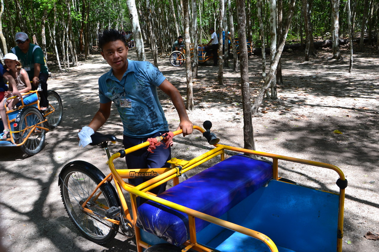 Da die Wege auf dem Coba-Areal ziemlich weit sind, sind wir mit einer „mexikanischen Rikscha“ gefahren. Der Fahrer sitzt dabei hinten und die Fahrgäste vorne. Eine unterhaltsame Angelegenheit, zumal die Fahrer es oft als sportliche Herausforderung sehen, alle anderen zu überholen ;-)