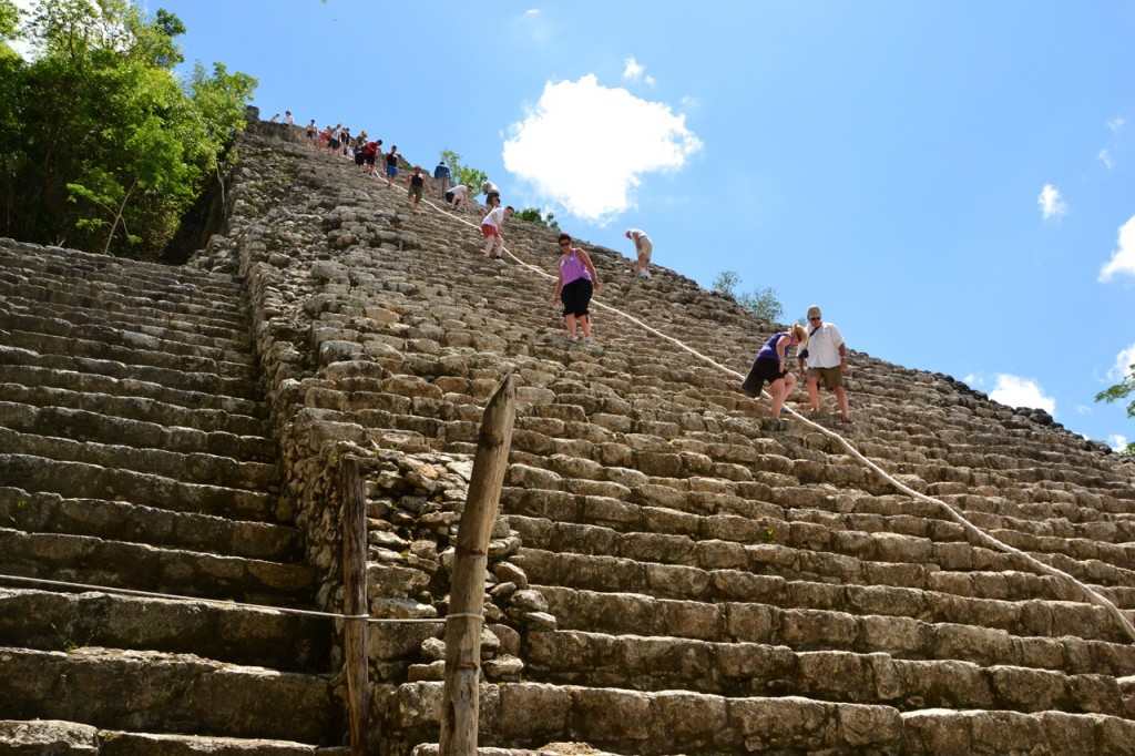 Zu bewundern gibt es auf dem riesigen Areal Cobas Sacbes (weiße Straßen der Maya), Ballspielplätze, das Observatorium und nicht zu vergessen: Nohoch Mul, mit ihren 42m und 120 Stufen die höchste Pyramide Yucatans. Und das Beste: Die einzige Pyramide, die noch bestiegen werden darf. Zuerst denkt man noch der Austieg seih nicht wirklich schwierig, aber nach ein paar der ausgetretenen Ruinenstufen merkt man schnell, dass die Treppe irre steil ist und die Hitze ihr übriges tut, damit man total feritg oben ankommt. Der Blick über den Dschungel ist gigantisch.