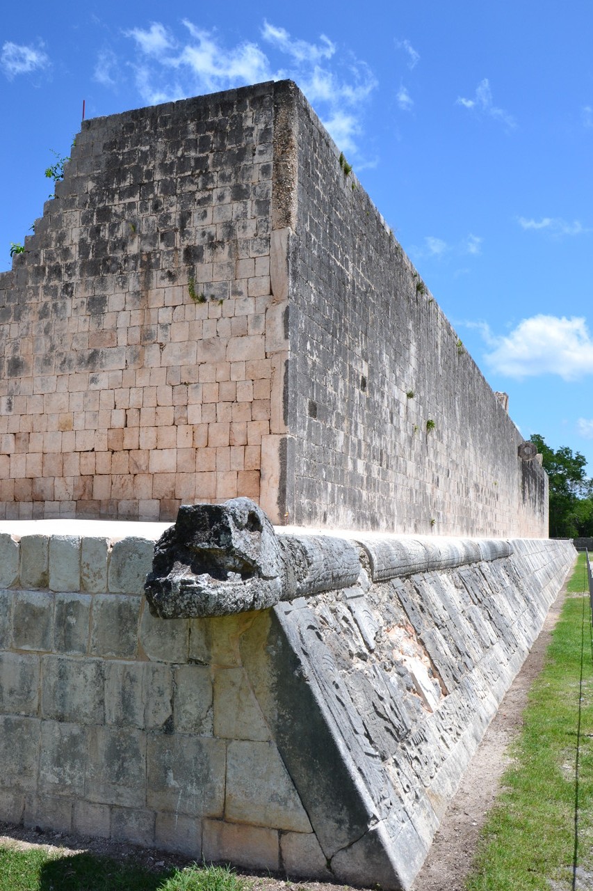 Nach zahlreichen Erläuterungen durch Joop, geht es weiter zum größten Ballspielplatz (168m Länge)  Yucatans und Mesoamerikas. Man kann die beiden Ringe bestaunen und die zahlreichen Reliefs an der Mauer, die den Platz eingrenzt. So ist auf Höhe des rechten Ringes eine Szene abgebildet, die darstellt, wie der Gewinner dem Verlierer den Kopf abschlägt und dessen Hals Blut in Schlangenform spritzt.