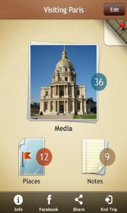 Legt man jetzt einen neuen Trip an, erfolgt das Befüllen mit Inhalt in erster Linie über sogenannte „Places“ und „Notes„. Places sind eigentlich nichts anderes als Wegpunkte und Notes sind die dazugehörigen Notizen. Trip Journal zeichnet nämlich die Reise mit GPS-Informationen und Wegpunkten auf, um daraus einen Track zu generieren. Man kann also zu einem Ort, an dem man sich aufhält GPS-getaggte Fotos oder Videos speichern und dazugehörige Notizen, also Eindrücke verfassen.