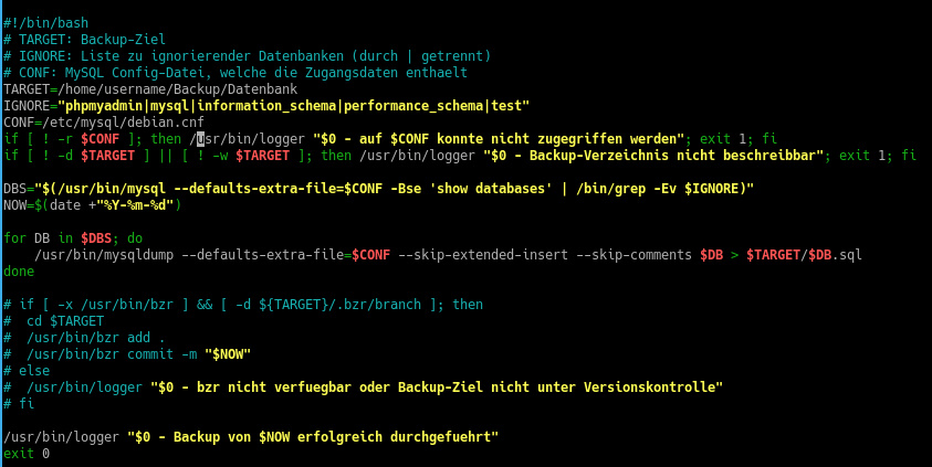 Der Abzug der Datenbankinhalte erfolgt dann „on the fly“ mittels mysqldump. Das ganze Skript dbbackupscript.sh schaut dann wie folgt aus: