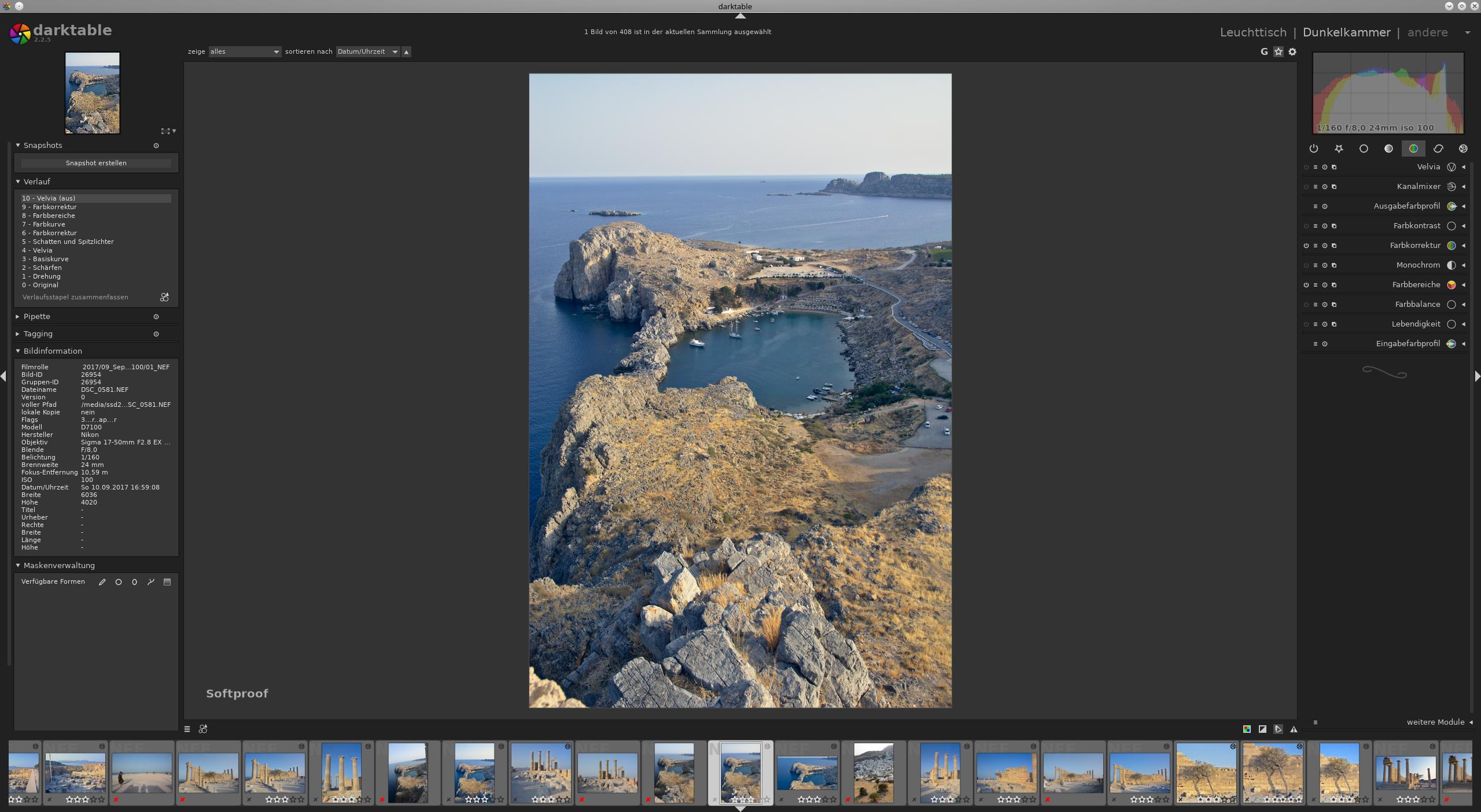 Im unteren Bereich sind alle Vorgänger- und Nachfolgefotos aufgelistet, was es einem einfach macht, durch die Bilder zu scrollen und das nächste Foto zur Bearbeitung auszuwählen – per Doppelklick oder per Leertaste zum nächsten Foto. Auf der linken Seite werden u.a. Bildinformationen und der Verlaufsstapel dargestellt, rechts sind die Bearbeitungsmodule aufgelistet, die in verschiedene Gruppen unterteilt sind: Favoriten, Basisgruppe, Helligkeitsgruppe, Farbgruppe, Korrekturgruppe und Effektgruppe. Natürlich ist hier auch das Histogramm oben rechts immer sichtbar, inkl. der Info bzgl. Belichtungszeit, Blende, Brennweite und ISO-Einstellung.