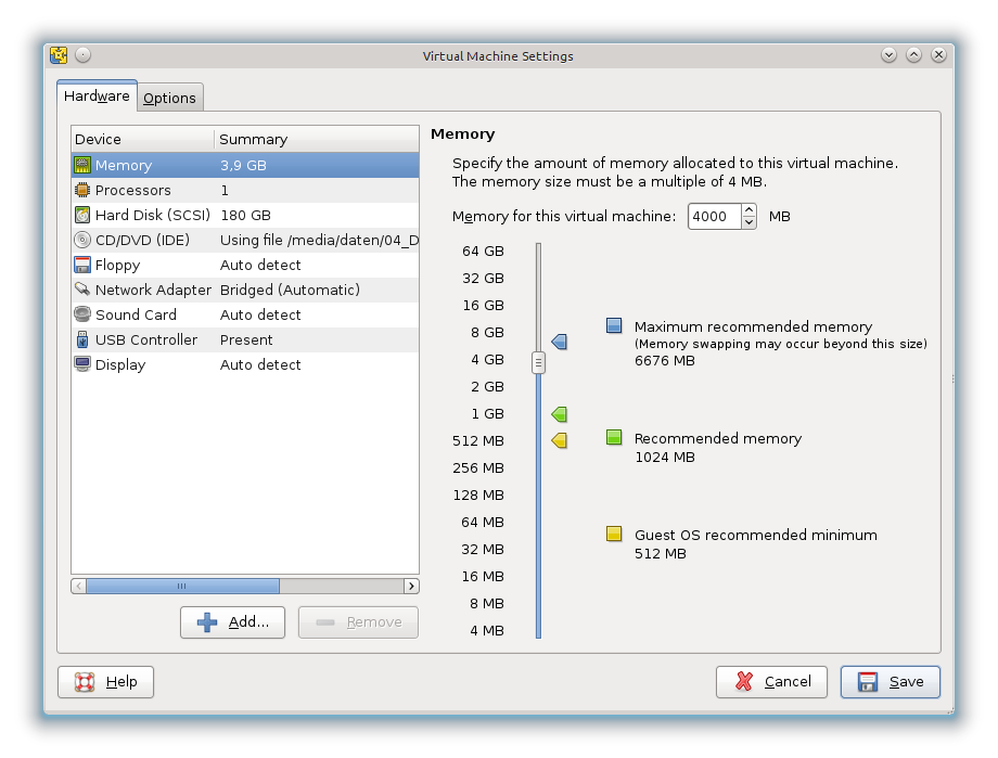 Vorausgesetzt, man hat bereits den kostenlosen VMware Player runtergeladen und installiert, legt man sich eine nackte virtuelle Maschine an, mit einer Festplatte, die groß genug ist, um unser Image aufnehmen zu können. Nachfolgend die Einstellungen, wie sie bei mir aussehen (zum Vergrößern klicken):