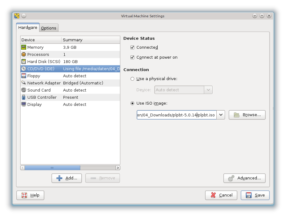 Diese ISO binden wir jetzt fest in die VM als CDROM ein (zum Vergrößern klicken):