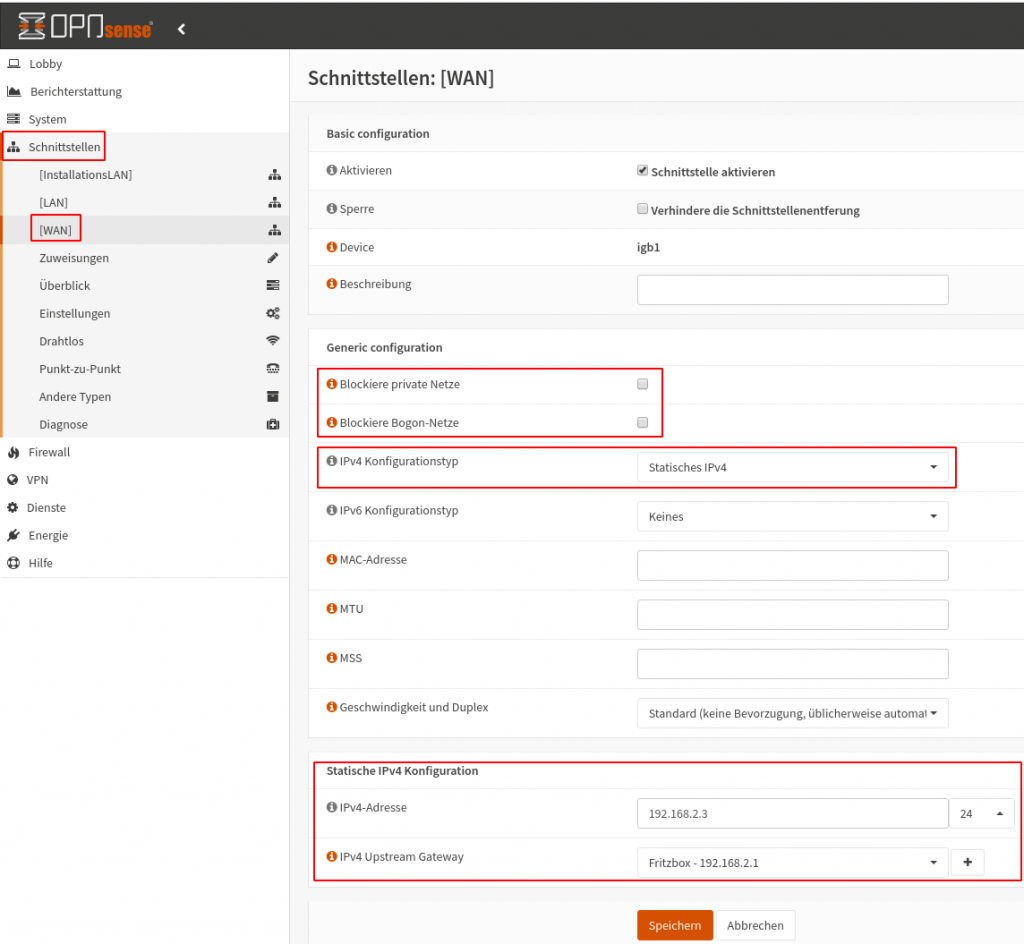 • Die OPNsense Firewall benötigt auf WAN eine feste IP-Adresse aus dem Adressbereich des Routers (nicht des internen Netzwerks hinter der Firewall!)