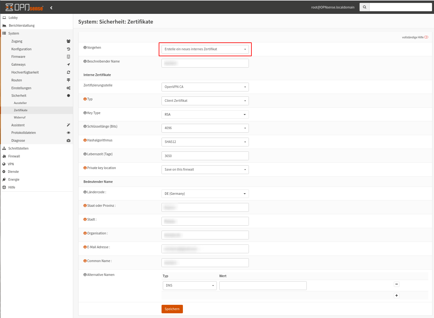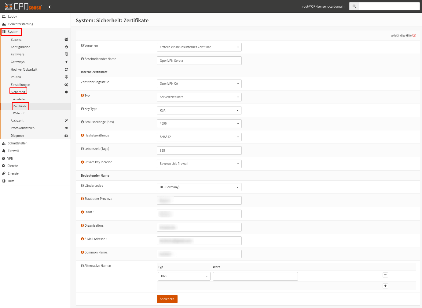 Im nächsten Schritt erzeugen wir uns ein Serverzertifikat unter System -> Sicherheit -> Zertifikate -> Hinzufügen. Im Screenshot sieht man die genauen Einstellungen. Die ausgepixelten Felder sind wieder nach persönlichen Gegebenheiten zu befüllen.