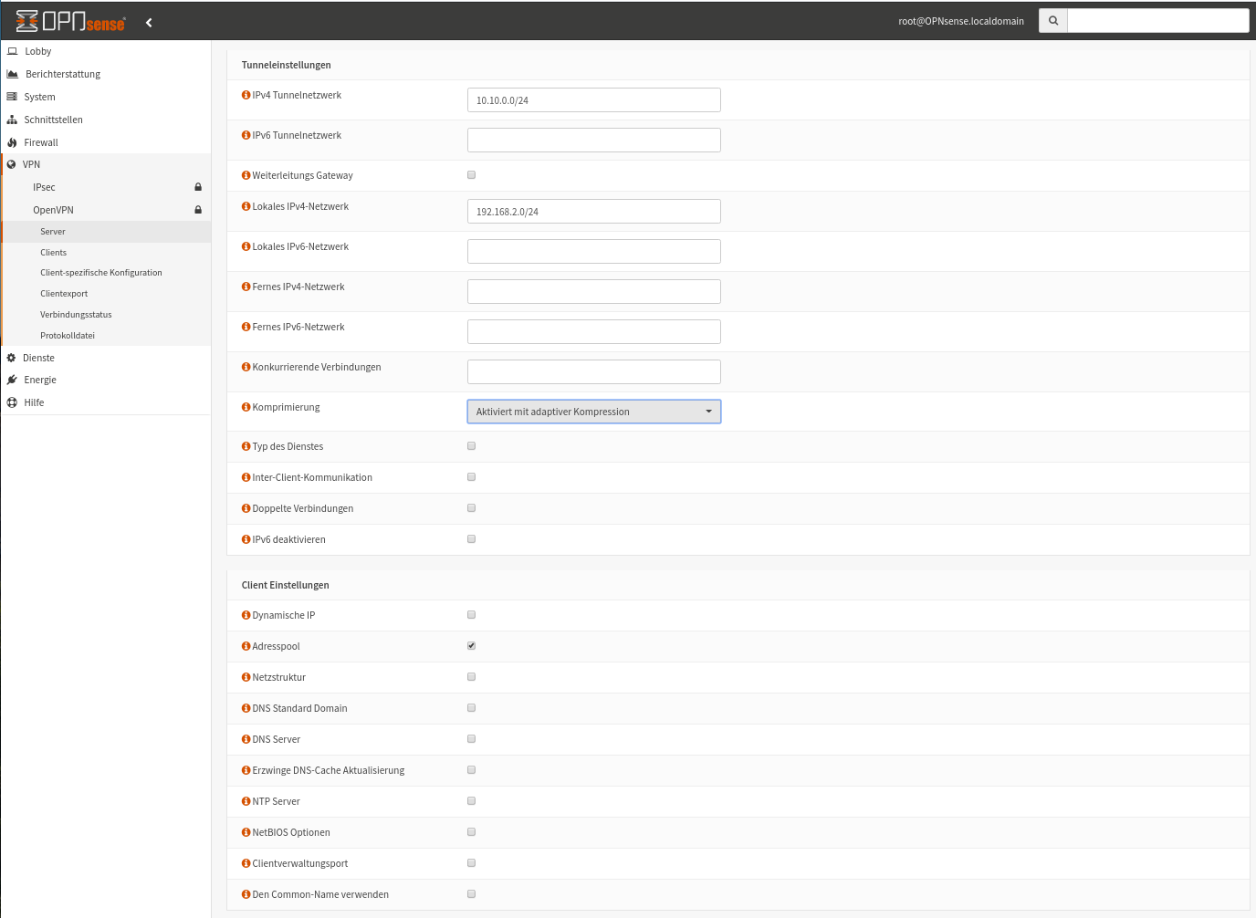 Damit öffnet sich die Eingabemaske, mit der wir den OpenVPN Server im Detail konfigurieren. Die Einstellungen sieht man in den nächsten Screenshots. Unter „lokale Gruppe erzwingen“ finden wir auch unsere VPN-Gruppe wieder. Das bedeutet, dass der User, der sich mit einem VPN-Client verbinden will, in der VPN Gruppe sein muss. Andernfalls wird die Verbindung abgelehnt.