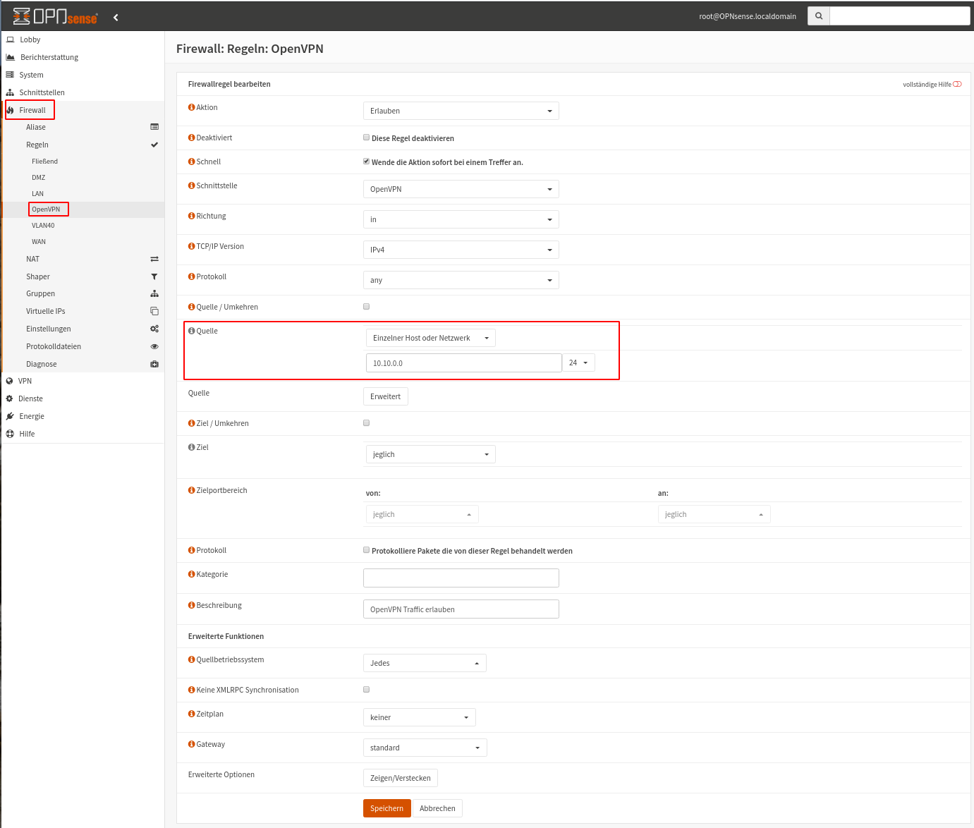 Jetzt noch die zweite Regel für OpenVPN unter Firewall -> Regeln -> OpenVPN -> Hinzufügen.