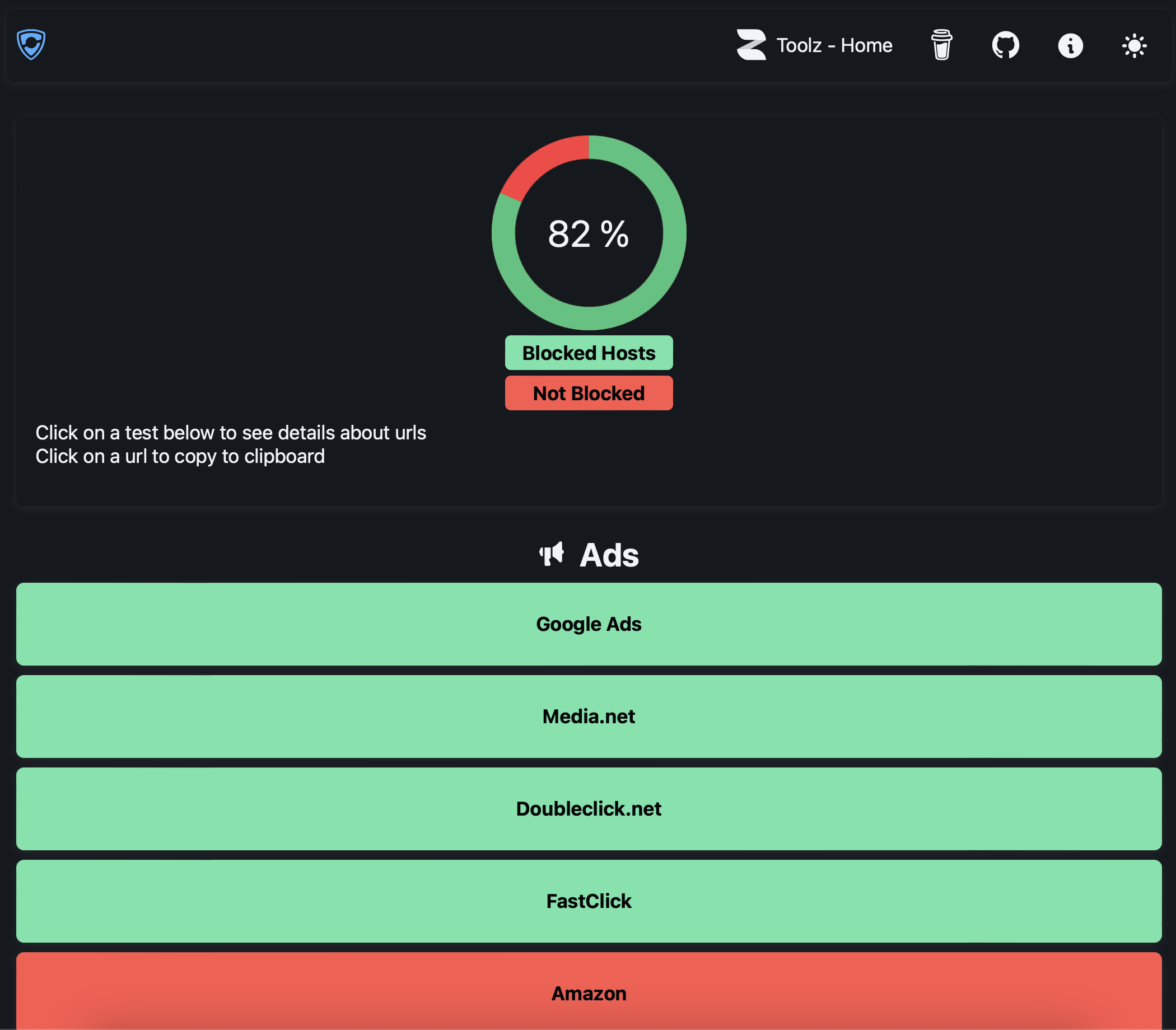 Zum Testen, wie gut der Blocker arbeitet, kann man folgende Seite nutzen und dort auf AdBlock Test klicken: https://d3ward.github.io/toolz/