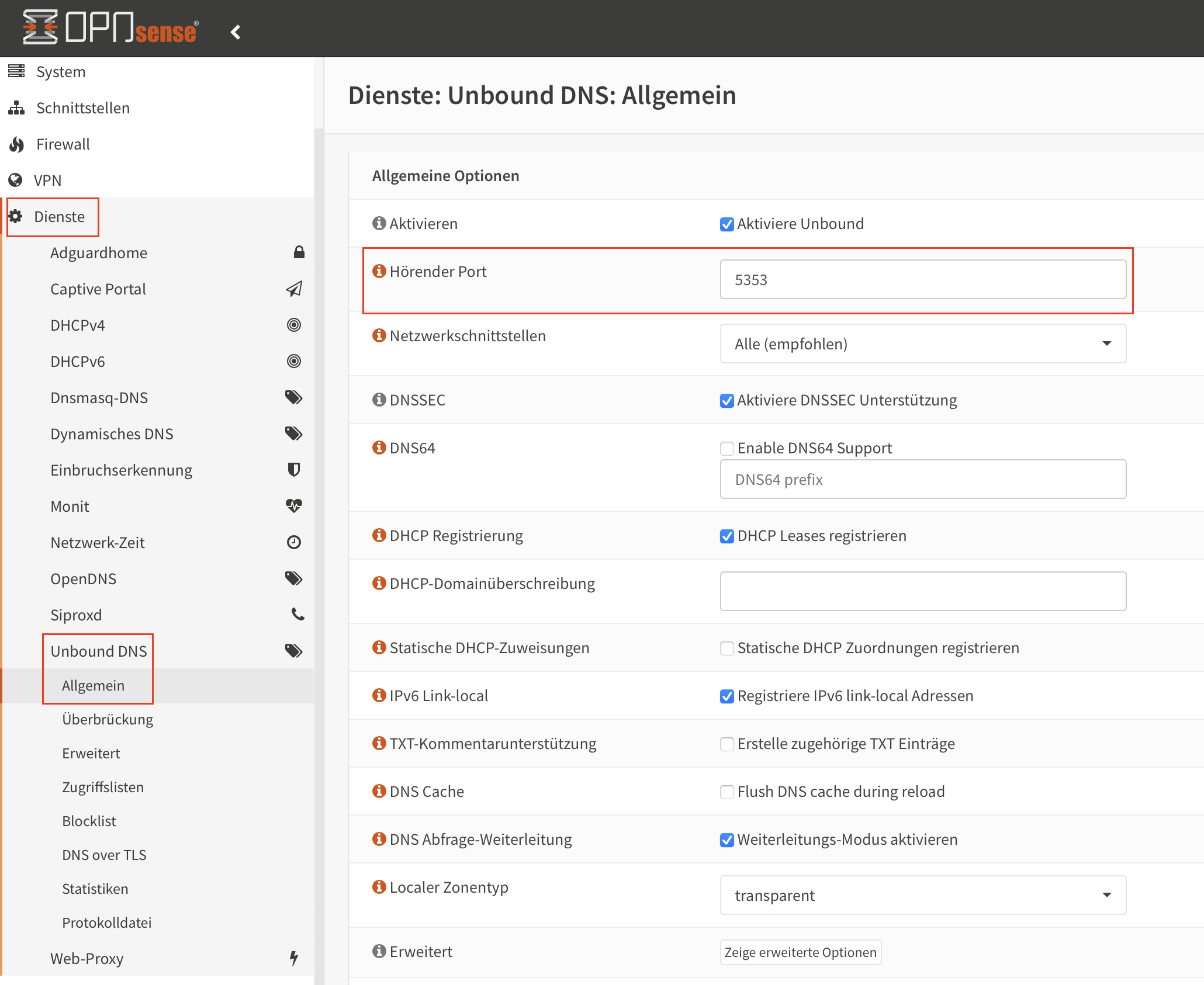 Dienste -> Unbound DNS --> Allgemein --> Hörender Port
