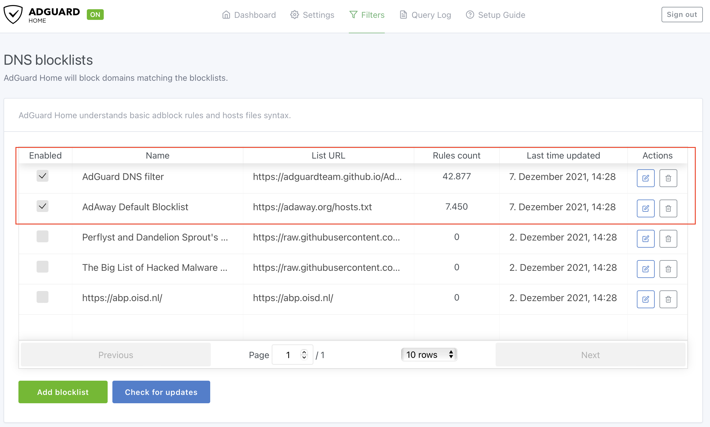 • Es spricht natürlich nichts gegen die Verwendung von Sperrlisten in Unbound. AdGuard bietet aber deutlich mehr Komfort bei der Verwaltung der Sperrlisten und bei der Informationsübersicht bzgl. gesperrter Anfragen etc.