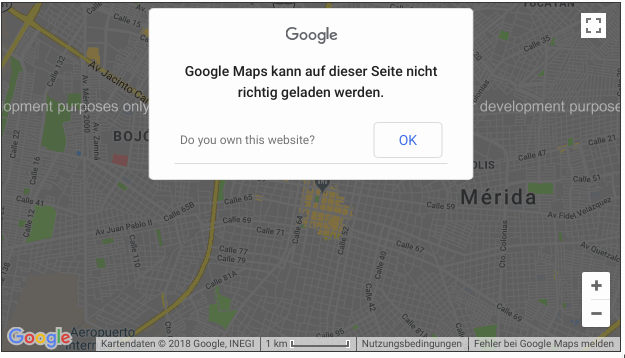 Mir war das gar nicht bekannt und bin erst durch eine Internetrecherche darauf gestoßen, als ich immer wieder bemerkt hatte, das Kartenmaterial auf meiner Seite nicht richtig geladen wird und ein Wasserzeichen eingeblendet wird, mit dem Wortlaut „for development purpose only“ (in etwa „nur für Entwicklungsprojekte“ ). Komischerweise kam das Wasserzeichen und die Meldung nicht immer.