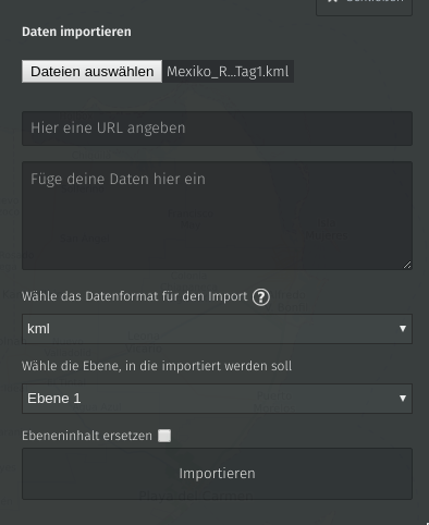 Im rechten Seitenmenü klickt man dann auf den Pfeil nach oben für Upload. Hier wählt man dann die vorhandene KML-Datei aus und klickt „importieren“ . Danach seht ihr sofort den Routenverlauf, wie er in der KML hinterlegt ist.