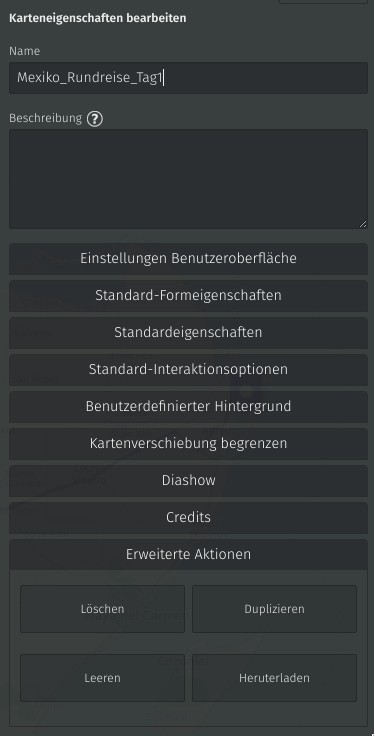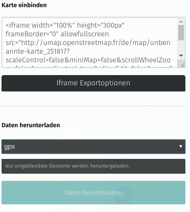 Wenn man fertig ist, klickt man im rechten Seitenmenü auf das Zahnrad. Oben kann man seiner Karte einen sinnvollen Namen verpassen, ganz unten klickt man dann auf „Erweiterte Aktionen“ und dann auf „Herunterladen„. Im darauf folgenden Dialog wählt man gpx als Dateiformat aus und klickt auf „Daten herunterladen“ . So migriert man also relativ schnell vorhandene KML in brauchbare GPX-Daten.