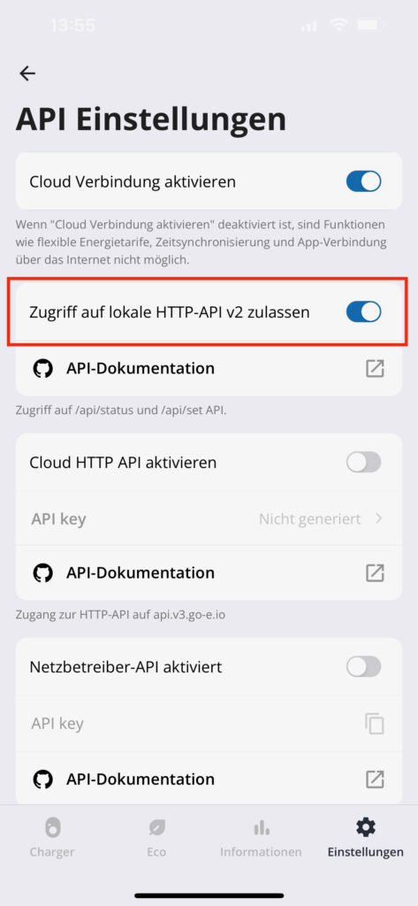 Damit evcc mit der Wallbox sprechen kann, muss auch hier der entsprechende Kommunikationsweg aktiviert werden. Dazu wählt man in der go-e App den Punkt Einstellungen rechts unten, dann den Punkt Verbindung und anschließend den letzten Eintrag API Einstellungen. Hier aktiviert man die Option Zugriff auf lokale HTTP-API v2 zulassen. Jetzt ist evcc in der Lage auch mit der Wallbox zu kommunizieren und auch die automatische Phasenumschaltung 1P/3P ansteuern.
