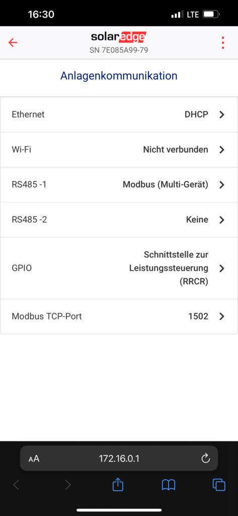 Um mit dem Wechselrichter kommunizieren zu können, muss zuerst Modbus TCP aktiviert werden. Die Aktivierung erfolgt über das Konfigurationsmenü des Wechselrichters, das man wie folgt aufruft: Den roten Wipp-Schalter auf der Unterseite des Wechselrichters einmal auf kurz nach links auf „P“ stellen und wieder loslassen. Jetzt ist der Wechselrichter im Konfigurationsmodus und stellt ein eigenes WLAN bereit. Dieses WLAN suchen und eine Verbindung mit einem beliebigen Gerät herstellen – z.B. dem Smartphone. Jetzt die Adresse 172.16.0.1 im Browser aufrufen. Unter dem Menüpunkt Anlagenkommunikation auf den letzten Eintrag Modbus TCP-Port klicken. Im Untermenü jetzt noch Modbus TCP auf Aktiviert setzen, der Port kann auf 1502 verbleiben. Die Portnummer auf alle Fälle merken oder notieren, da diese für die evcc Konfiguration notwendig ist. Ebenso die IP-Adresse unbedingt notieren, falls nicht vorher schon bekannt, diese wird für die richtige Konfiguration benötigt!
