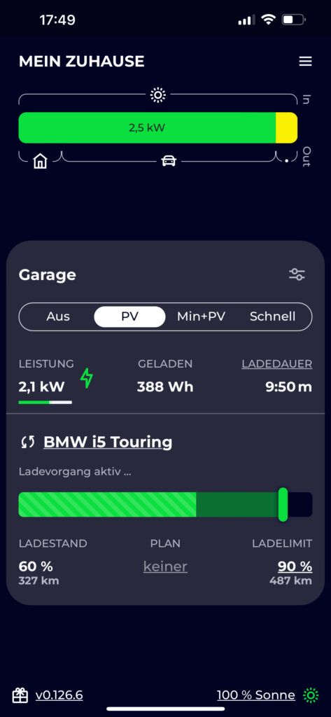 Nach der ersten Woche BEV-Laden und unterschiedlichen Lade-Szenarien bin ich schlichtweg begeistert von evcc. Mit teilweiser Unterstützung der Powerwall habe ich durchgängig 100% selbst erzeugte Energie in meinen e-BMW geladen. Klar, jetzt ist noch Sommer, das wird sich im Herbst und Winter ändern. Nichtsdestotrotz ist es ein gutes Gefühl, seinen Strom nicht mehr für 8,9 ct/kWh „verschenken“ zu müssen und dafür in sein Auto laden kann – ohne Netzbezug. Damit ist für mich evcc ein geniales Puzzleteil für die Energie- und Mobilitätswende, für das ich gerne einen monatlichen Obolus zur Unterstützung der Weiterentwicklung zahle (hier nähere Infos zum Github-Sponsoring von evcc)