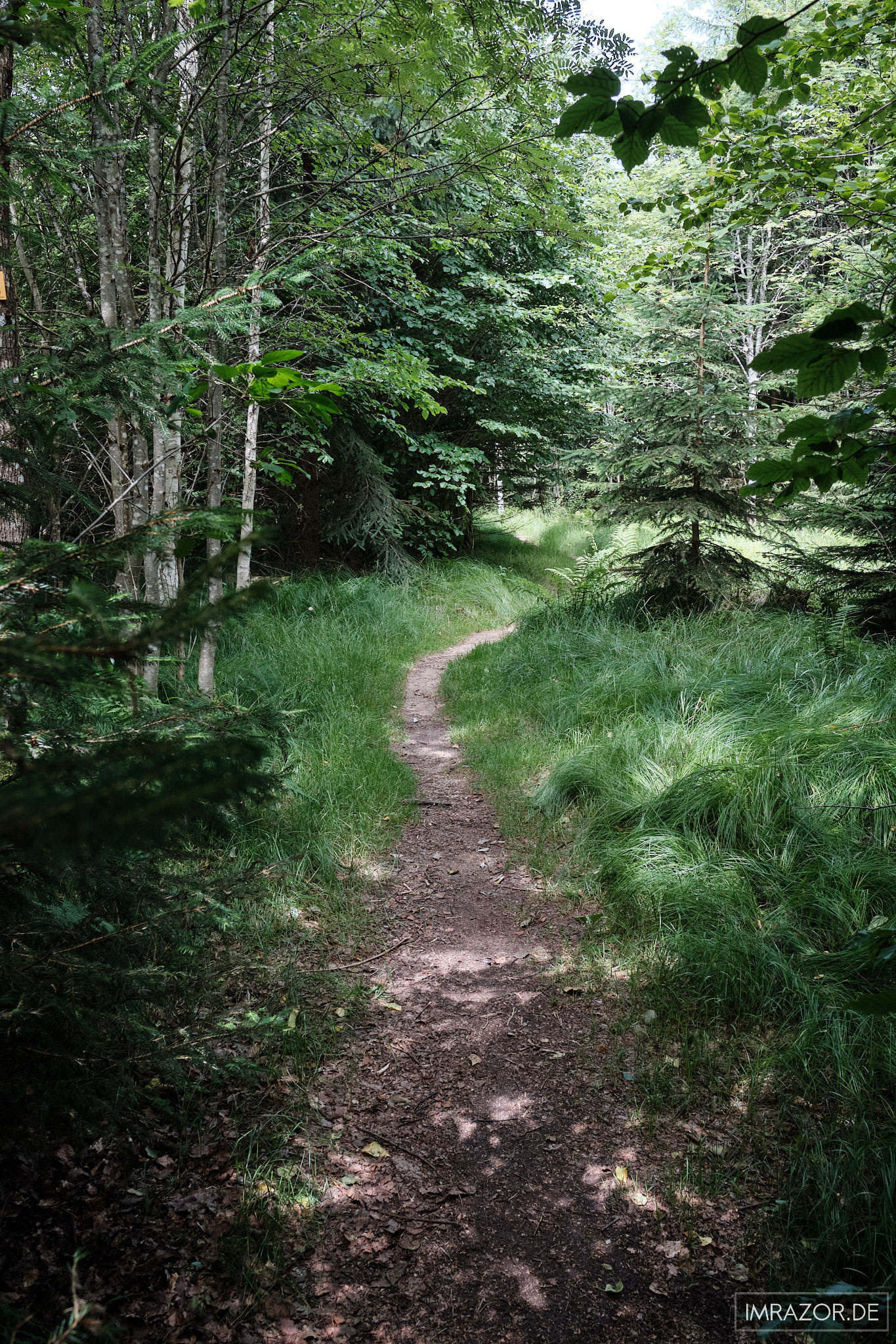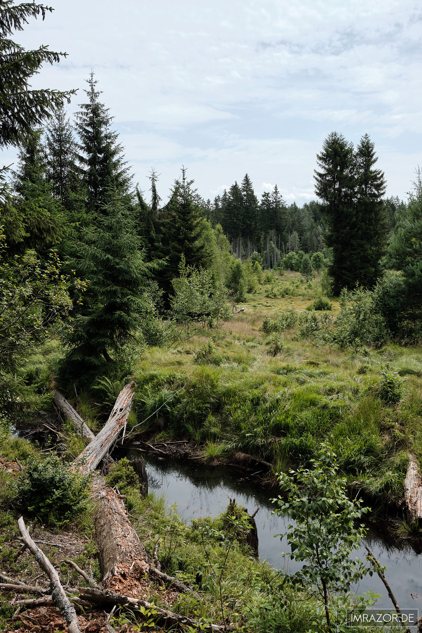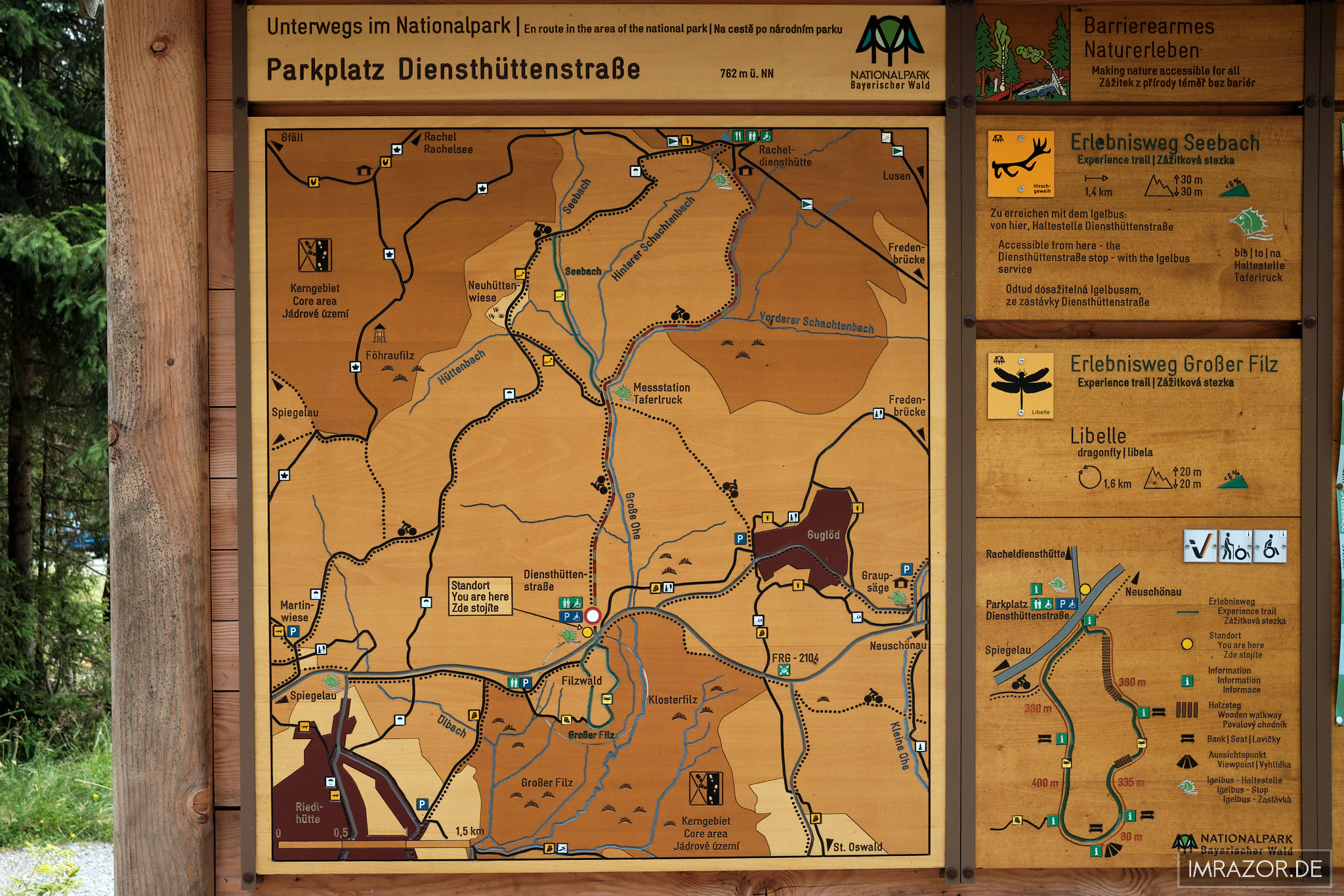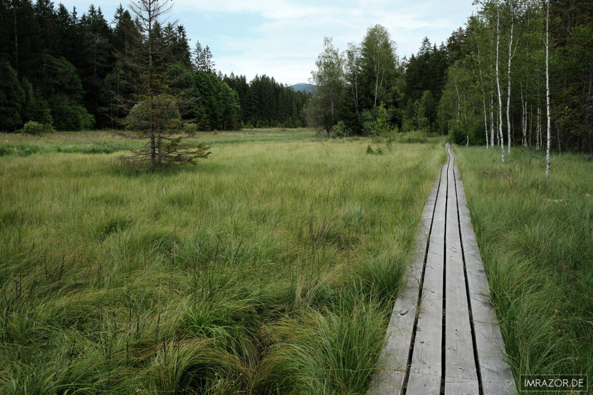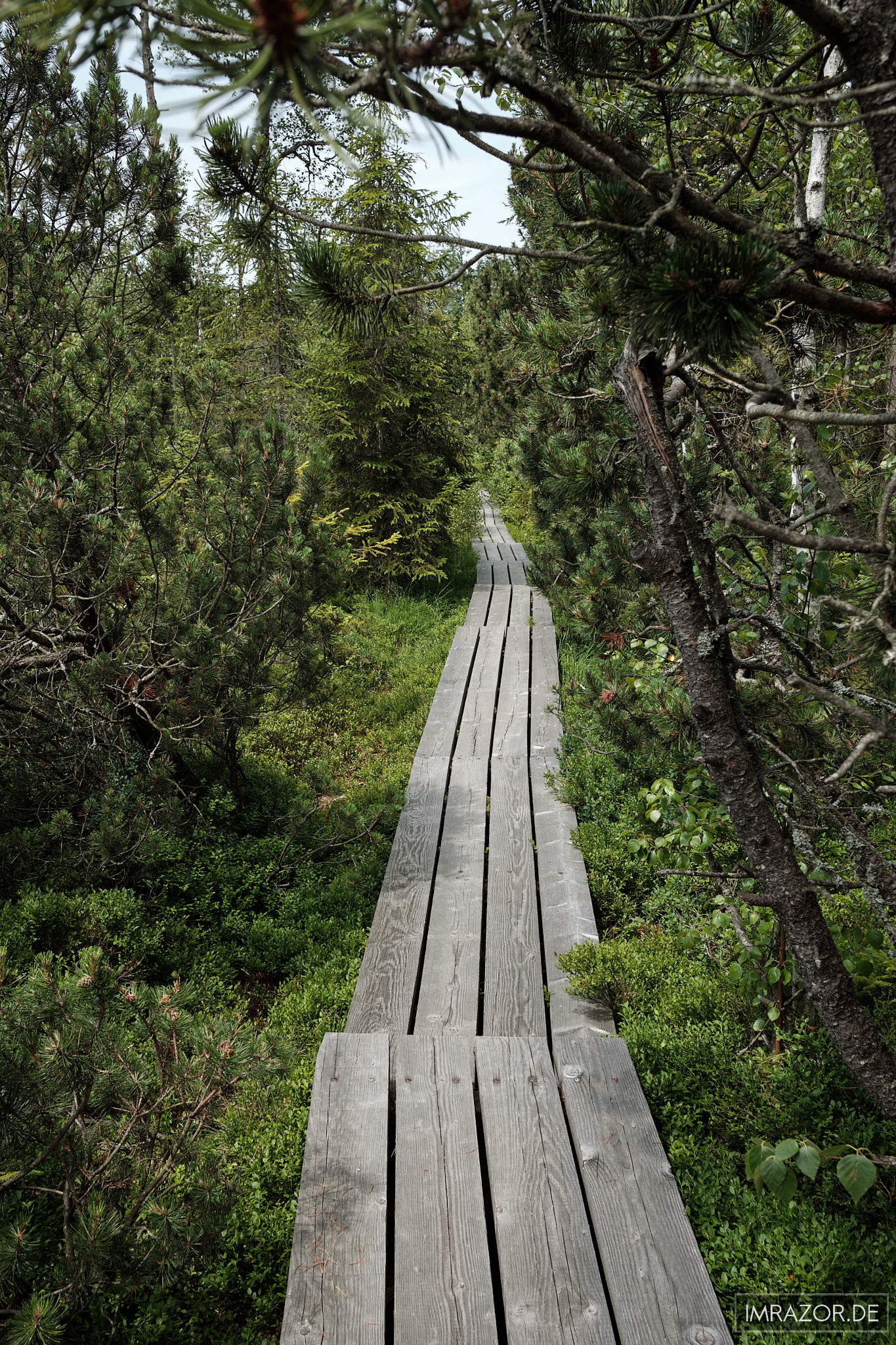 Heute wollen wir eine ganz spezielle Landschaft im Nationalpark Bayerischer Wald erkunden, den sogenannten Klosterfilz und Großen Filz. Wir starten unsere Rundtour gegen Mittag am Parkplatz Diensthüttenstraße, es ist Ende Juni, die Sonne lacht und die Temperaturen sind hier auf ca. 800m ü.N. angenehm warm. Lockere Wolken ziehen über den Himmel, die uns später noch einen kurzen Regenguss bringen werden. Vor uns liegt kein Gipfel und keine markante Erhebung – vielleicht sind auch deshalb keine anderen Wanderer unterwegs. Dabei zählen die Filze, niederbayerisch für Hochmoore, zu den ganz besonderen Lebensräumen für seltene Tiere und Pflanzen im Nationalpark, was sie wiederum für den Wanderer und Naturliebhaber eigentlich mehr als interessant macht. Während die Filze (mit den Schachten) um Buchenau nur schwer erreichbar sind und mit relativ lagen Fußmärschen einhergehen, sind der Klosterfilz und der Große Filz auf einem Rundweg an mehreren Stellen zugänglich. Das macht den etwa 12 km langen Weg ohne nennenswerte Anstiege auch für eine Familienwanderung mit Kindern interessant.