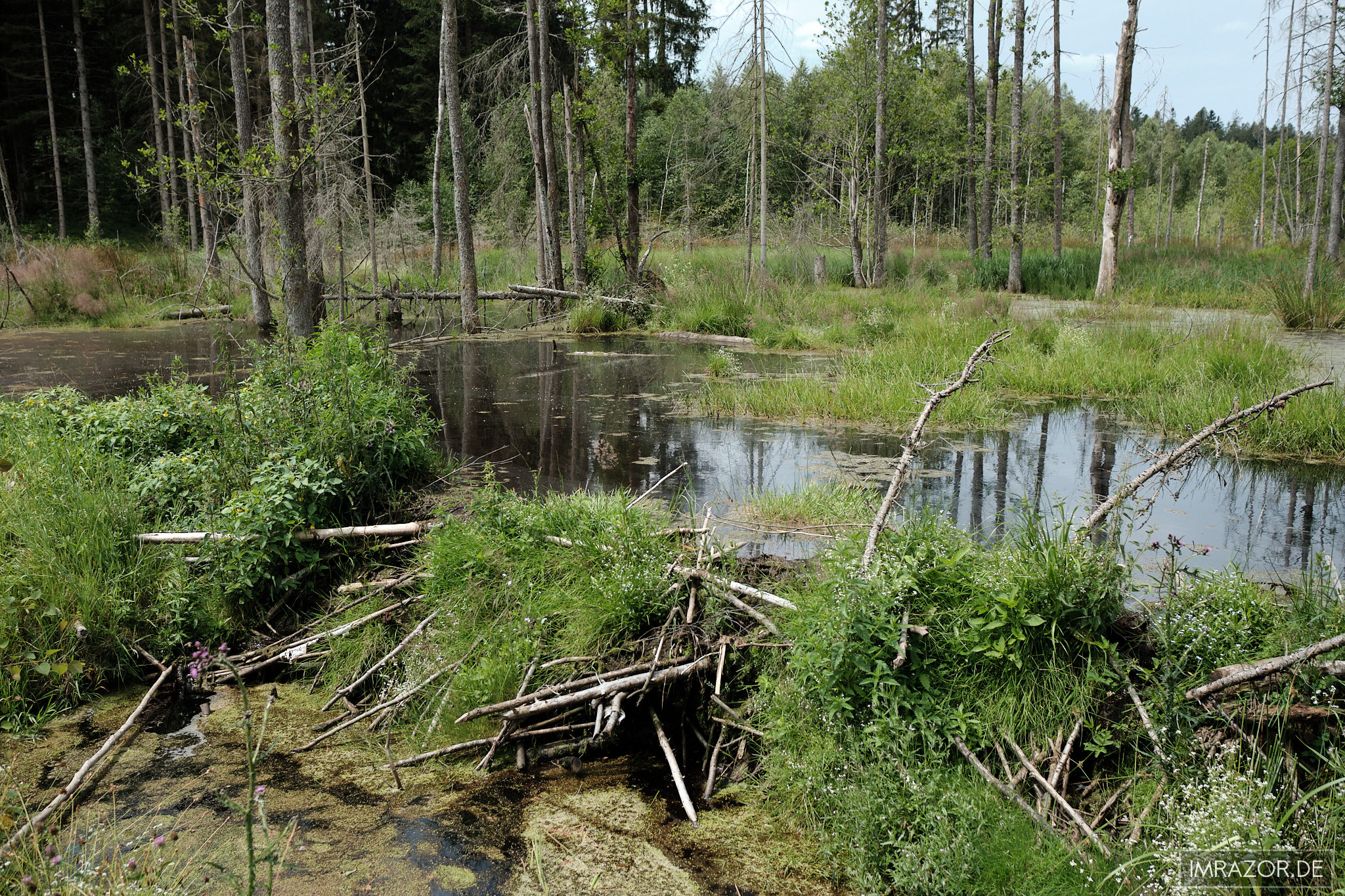 Traumhafte, schon fast mystische Pfade führen uns auf Bohlenwegen mit der Kennzeichnung Kreuzotter durch das Moor, kein anderer Wanderer weit und breit. Wir genießen die Eindrücke, bestaunen die Pflanzen- und Tierwelt und verlassen nach knapp 2km die Idylle, um auf einem Schotterweg weiter Richtung Riedlhütte zu gehen. Vorbei am eindrucksvollen Werk des Bibers – er hat hier einen kompletten Bereich durch mehrere Stauwerke überflutet – führt uns der Rundweg über den Triftweg durch Riedlhütte zum Alten Triftkanal. Dort geht es entlang der Großen Ohe zu einem für Kinder besonders interessanten Stelle: Einem Goldwaschplatz.