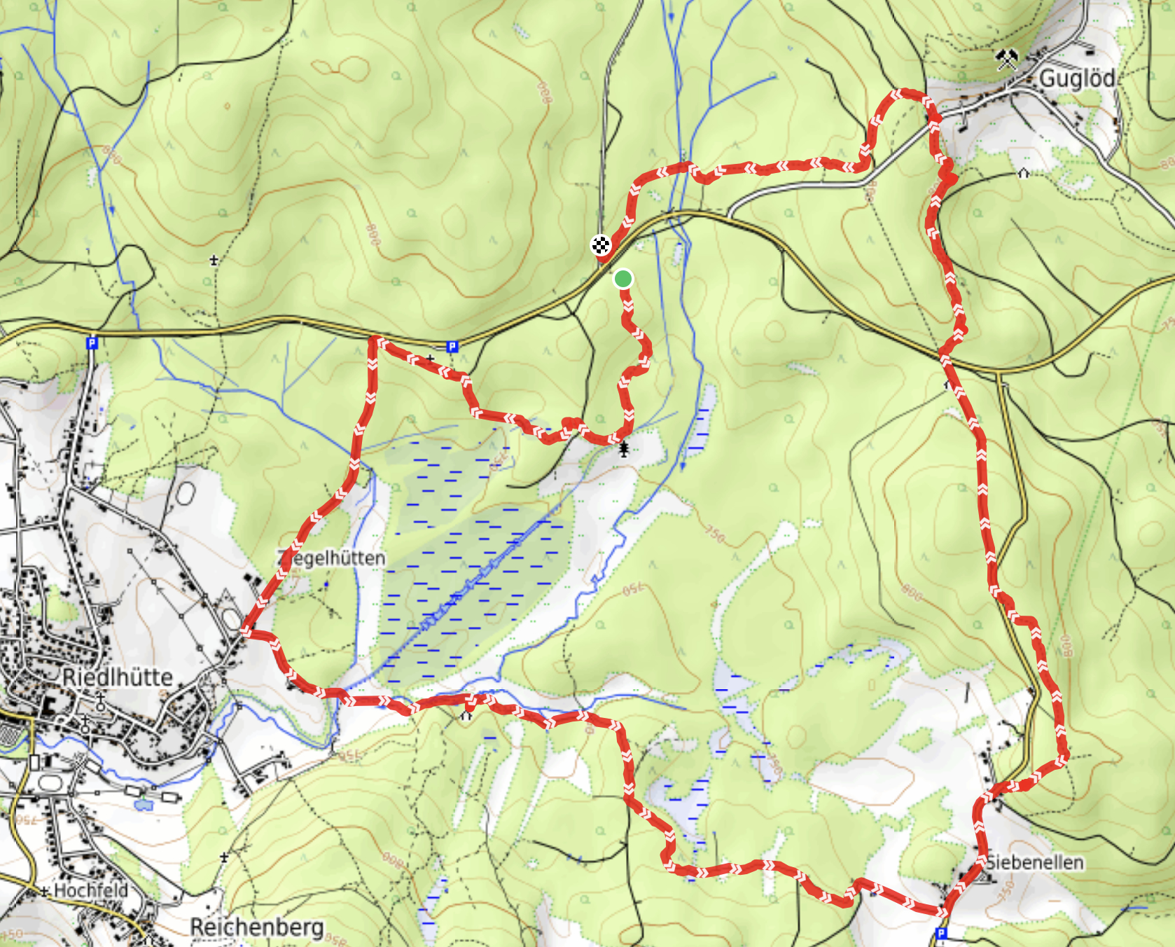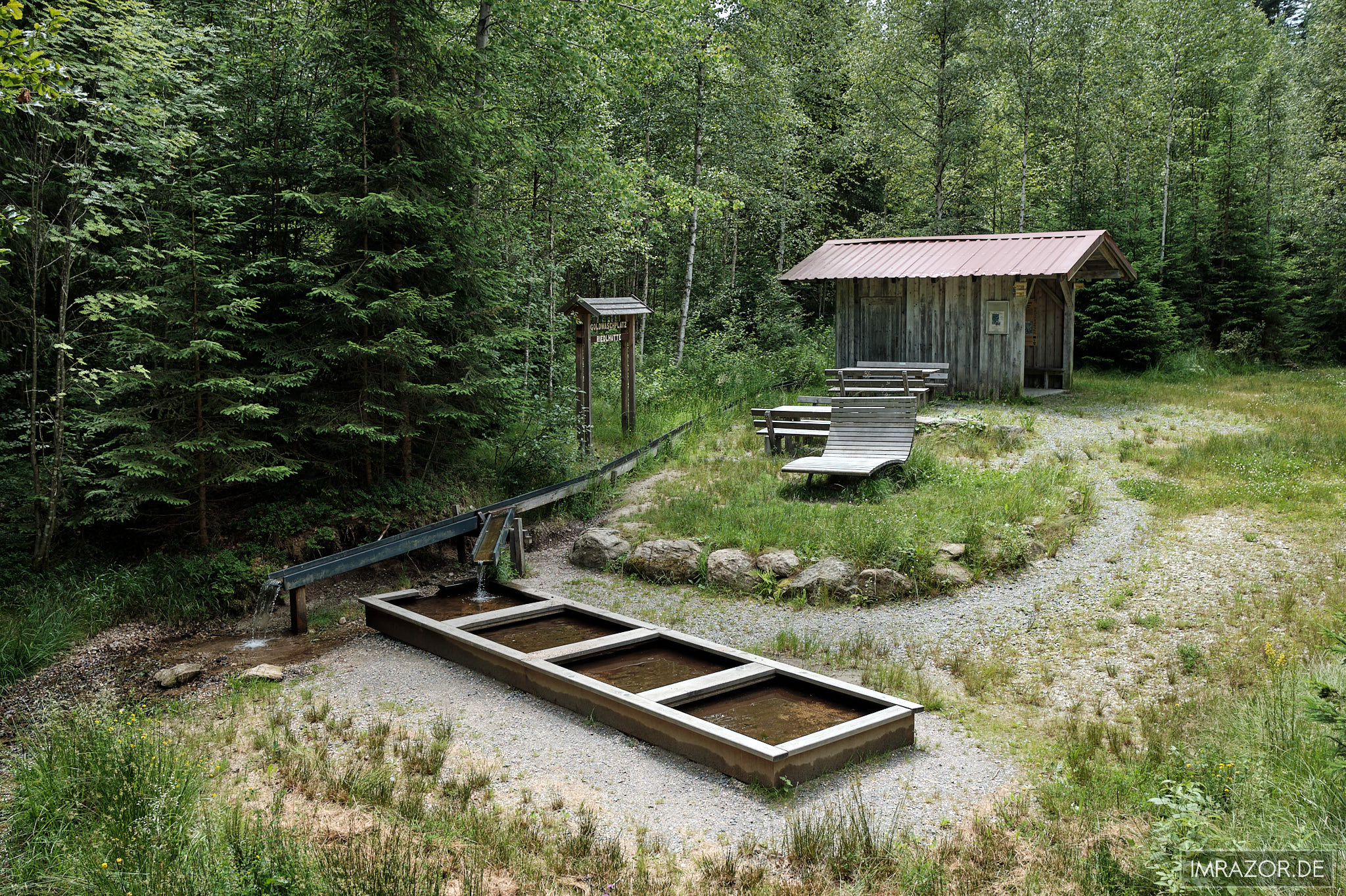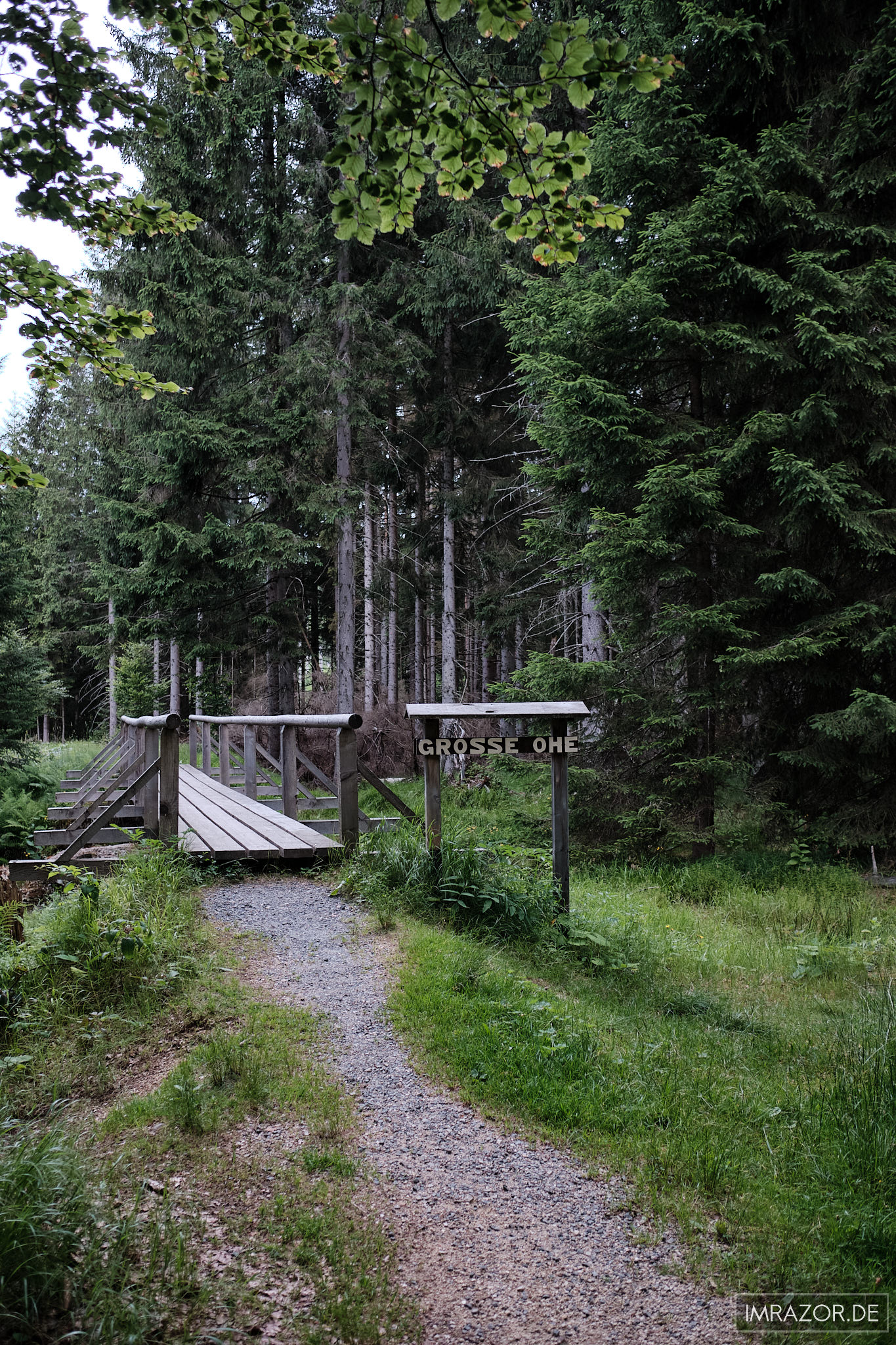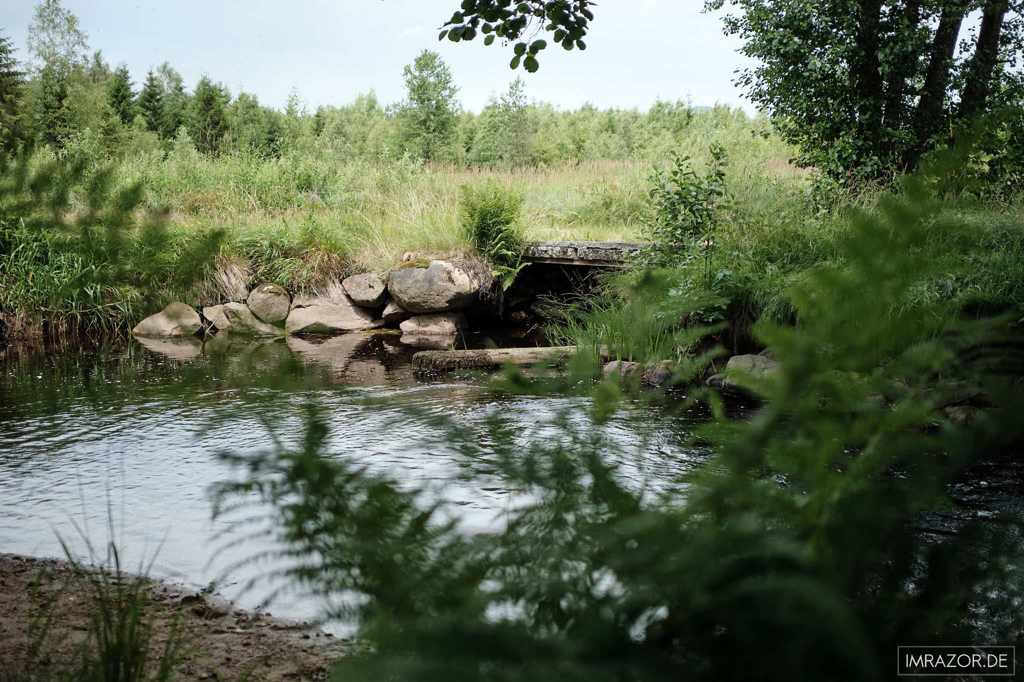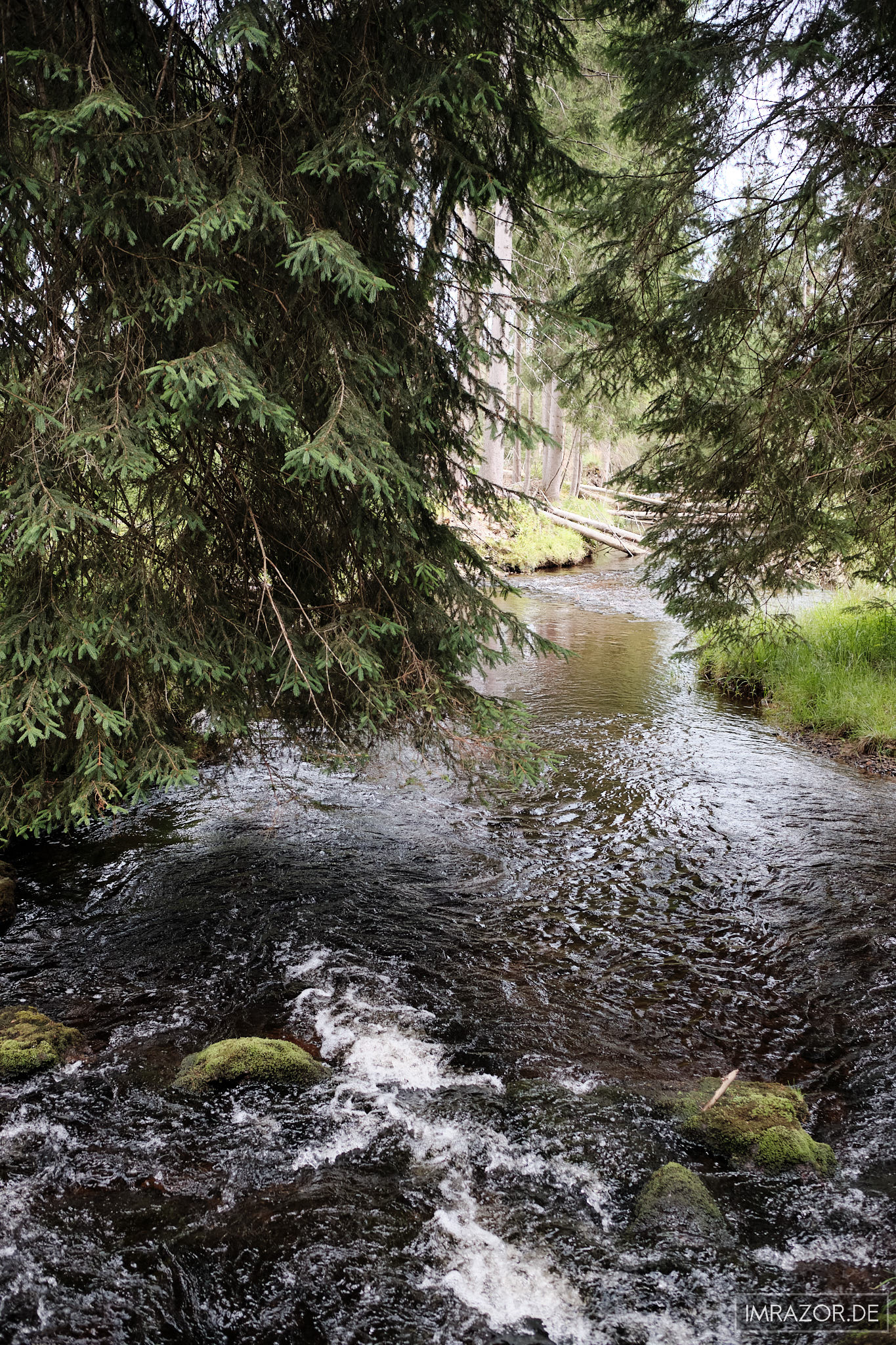 Nach etwa der halben Strecke muss etwa ein Kilometer über die wenig befahrende Landstraße zurückgelegt werden, bevor der Wanderweg wieder in den Wald wechselt. Über Guglöd geht es zurück zum Wanderparkplatz. Bevor wir diesen jedoch erreichen, queren wir über eine hölzerne Brücke die Große Ohe, die den Filz durchfließt und die wir am Alten Triftkanal bereits kennenlernen durften.